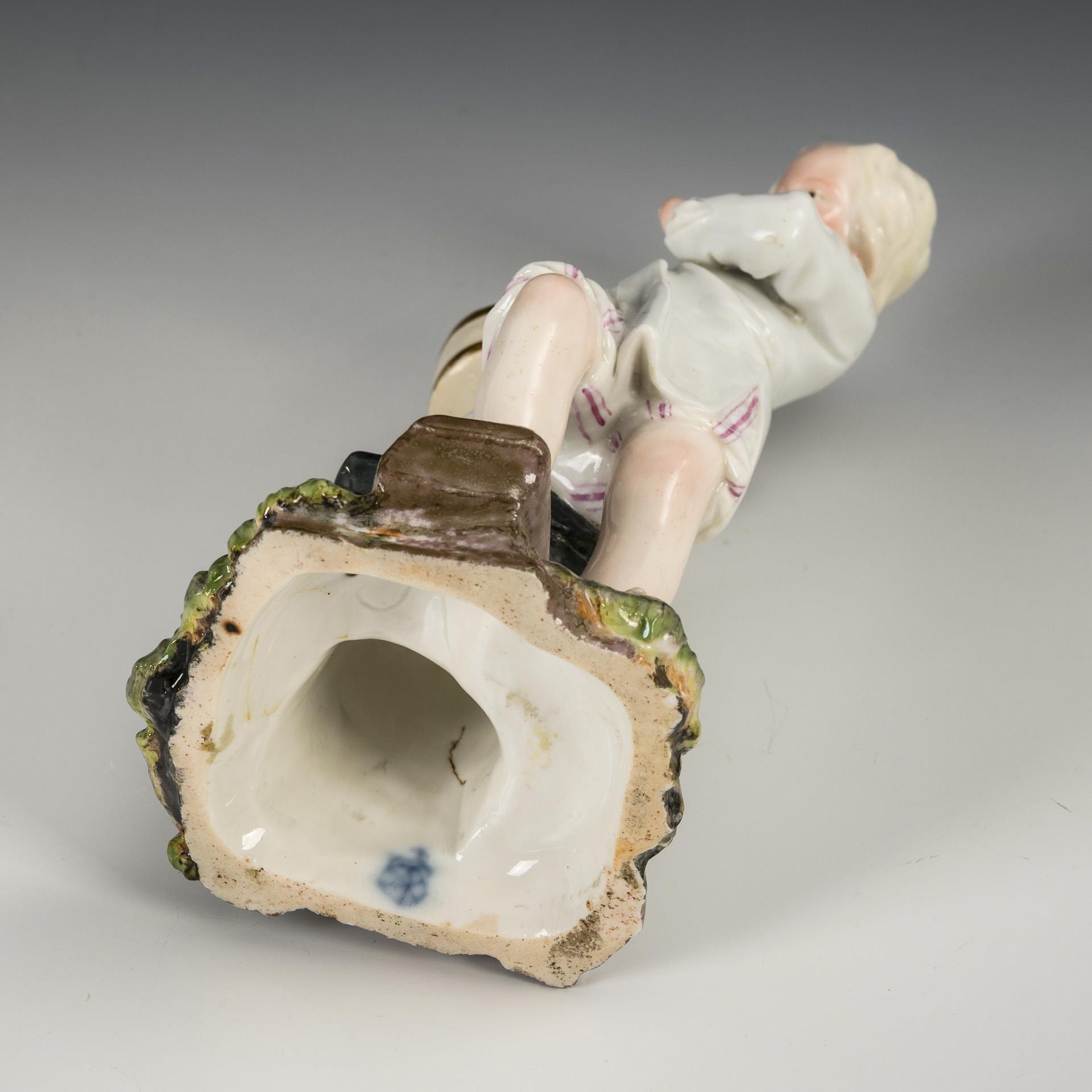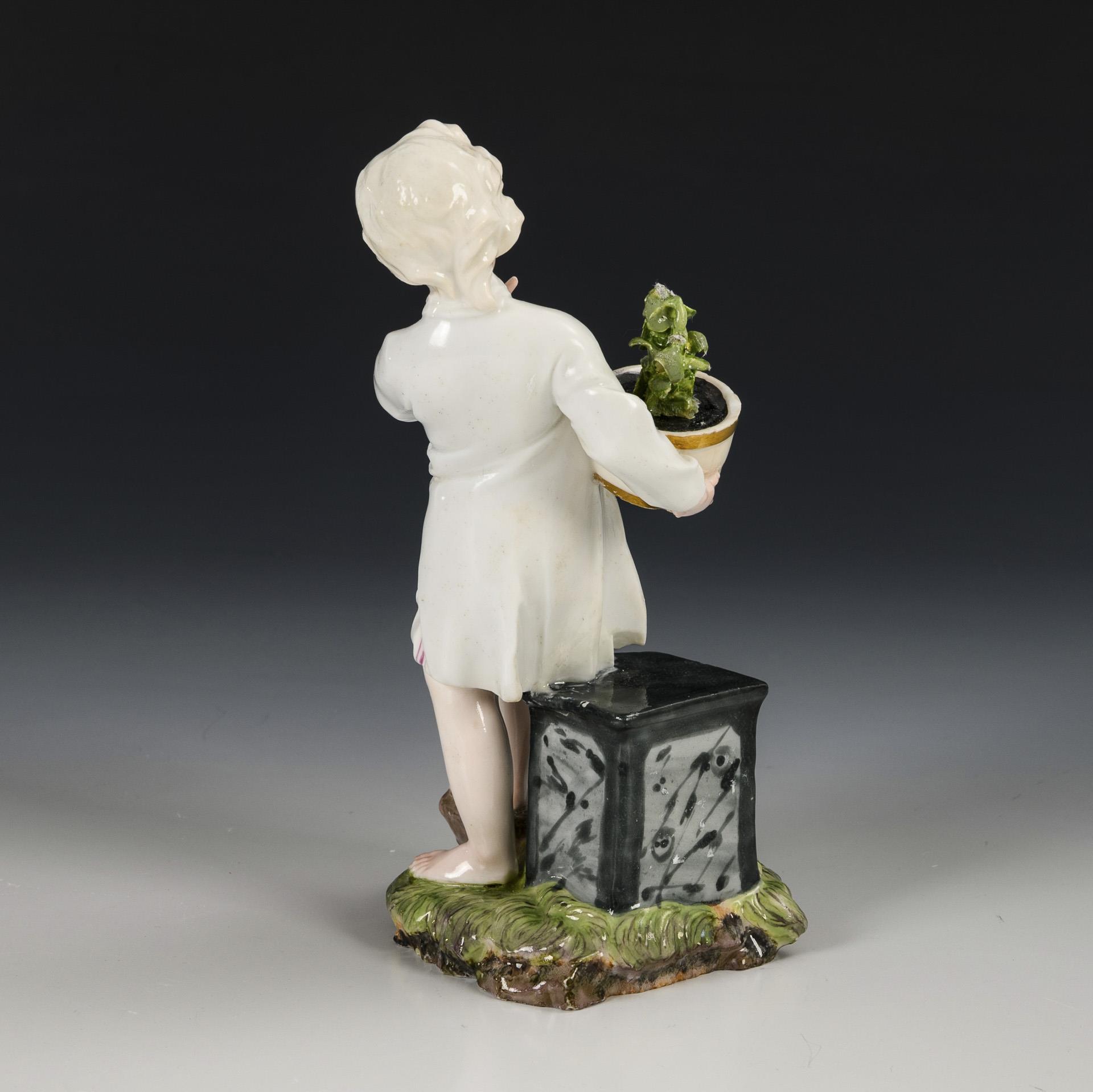 Boy carrying a flowerpot on a small plinth. Flowers and index finger restored.