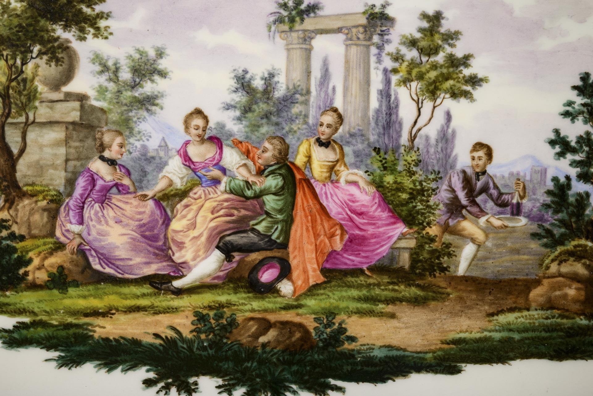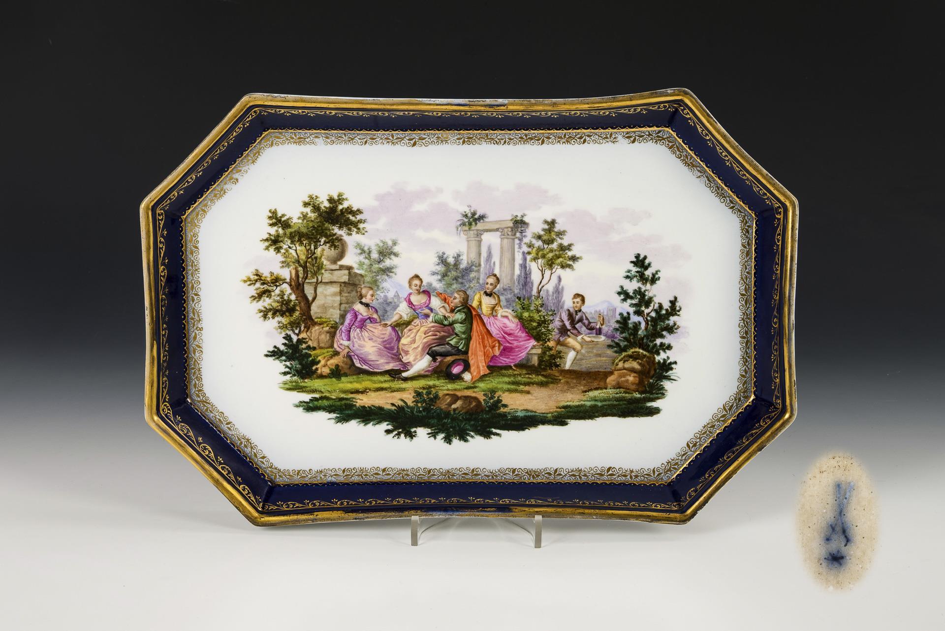 Rectangular tray with cut corners. Cobalt flag with gold border, in the mirror a park landscape with a five-figure rococo group. Partial gold abrasion, restoration to the flag.