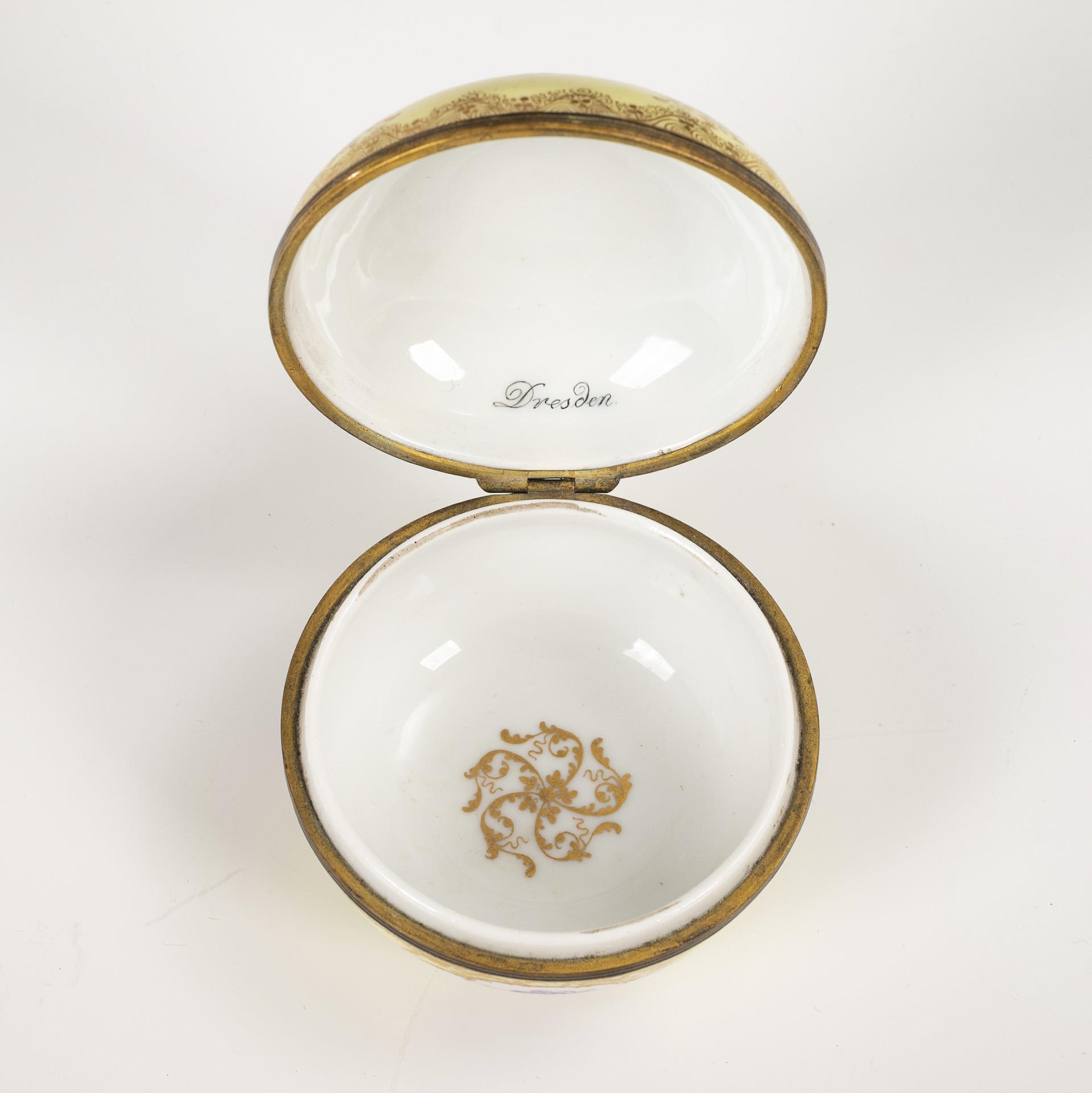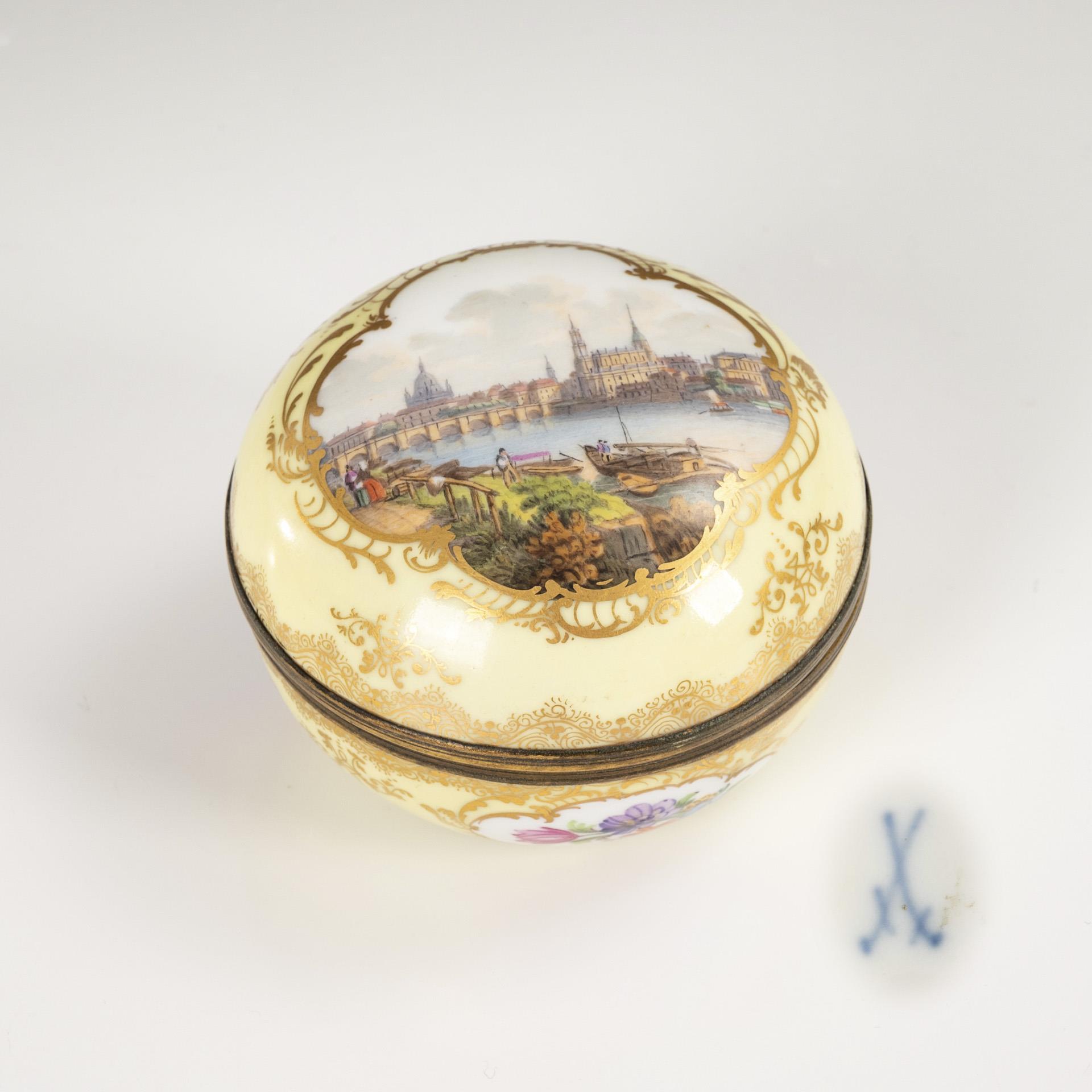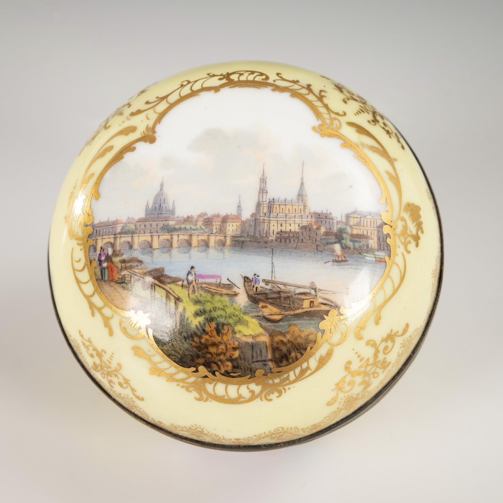 Pressed ball jar with metal-mounted hinged lid. Lemon yellow base with ornamental floral gold painting. On the lid a quatrefoil cartouche with a view of Dresden from the right bank of the Elbe, on the body three quatrefoil cartouches with flower painting. Lid rim restored.