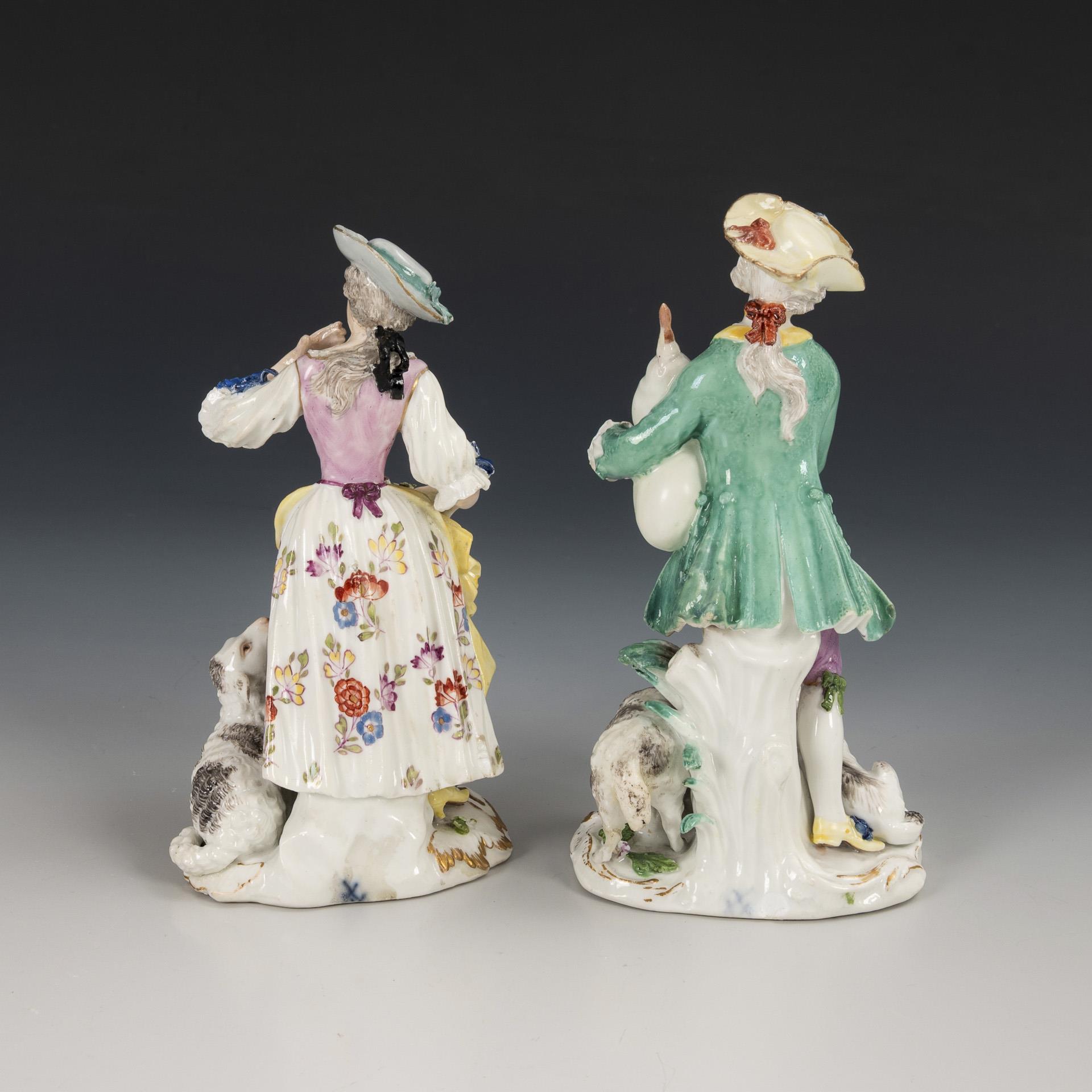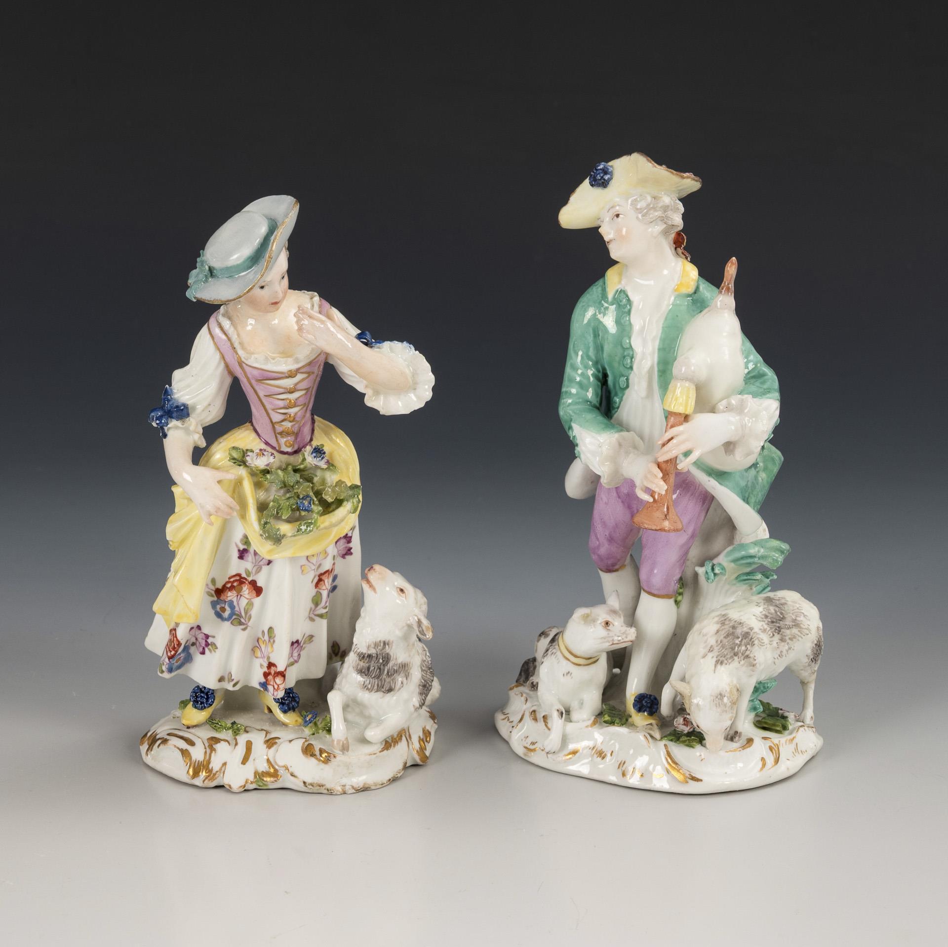 1x Shepherdess with flower-filled apron and sheep to her left. / 1x shepherd with bagpipes and a dog and a sheep at his feet. Restored.