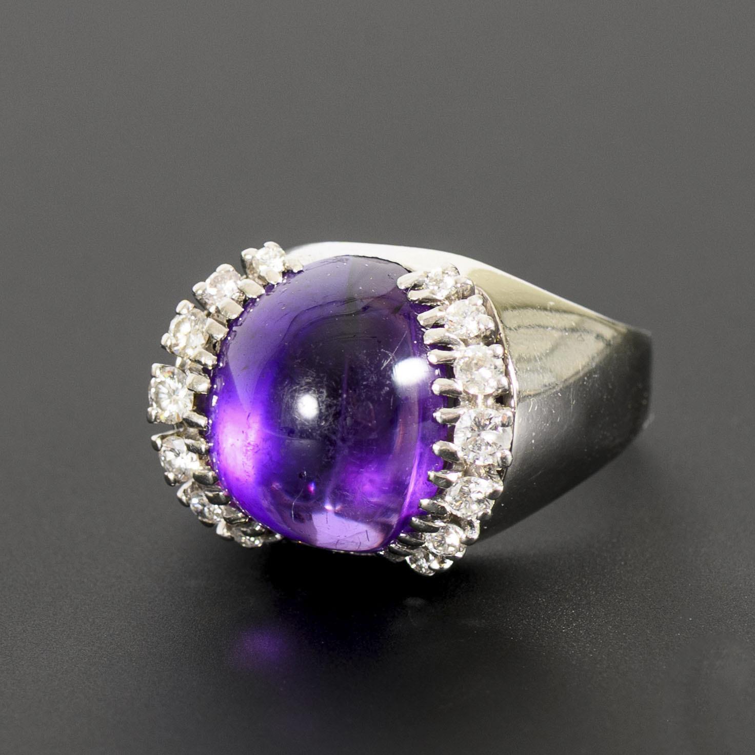 Unusual cocktail ring with amethyst cabochon and diamonds.