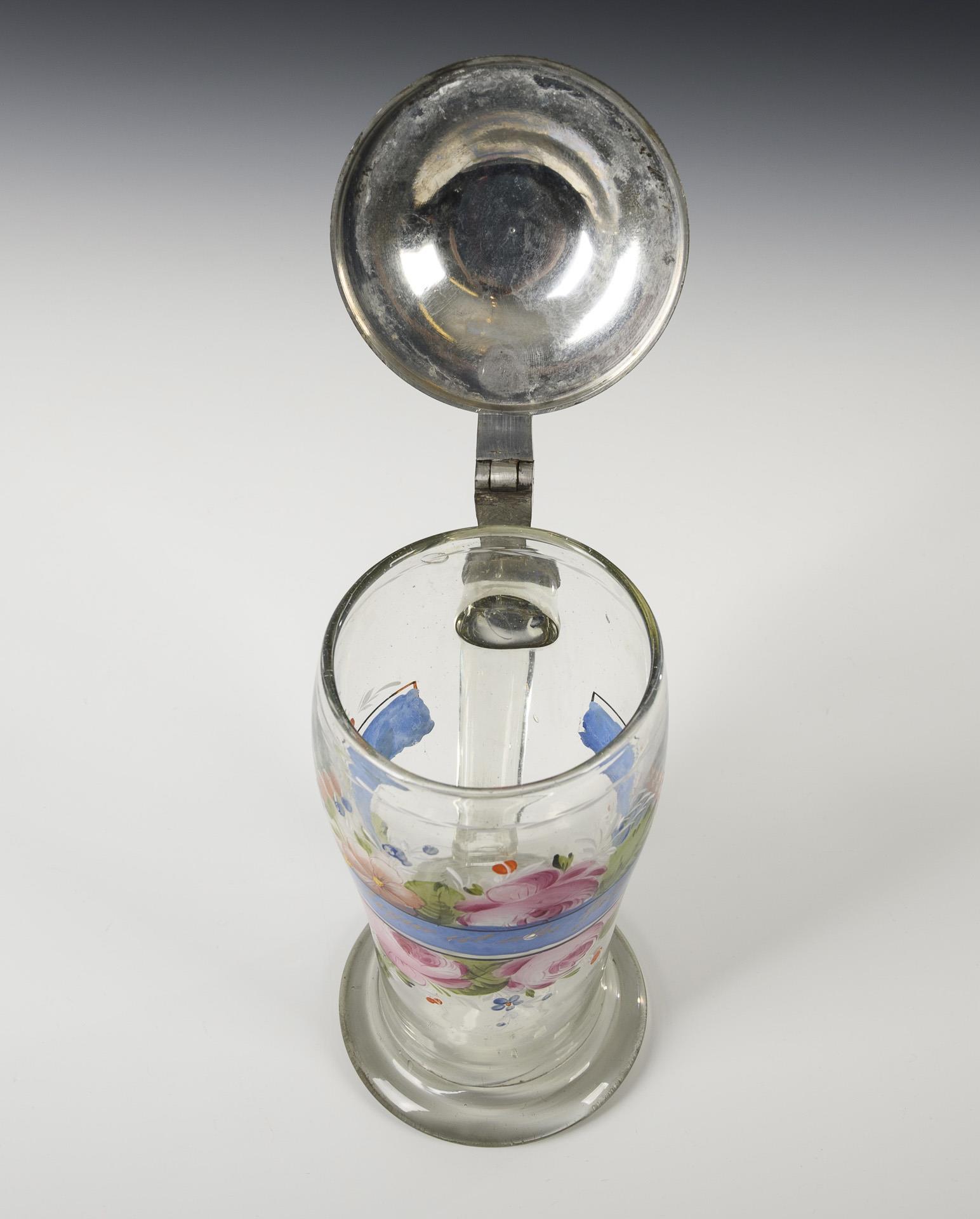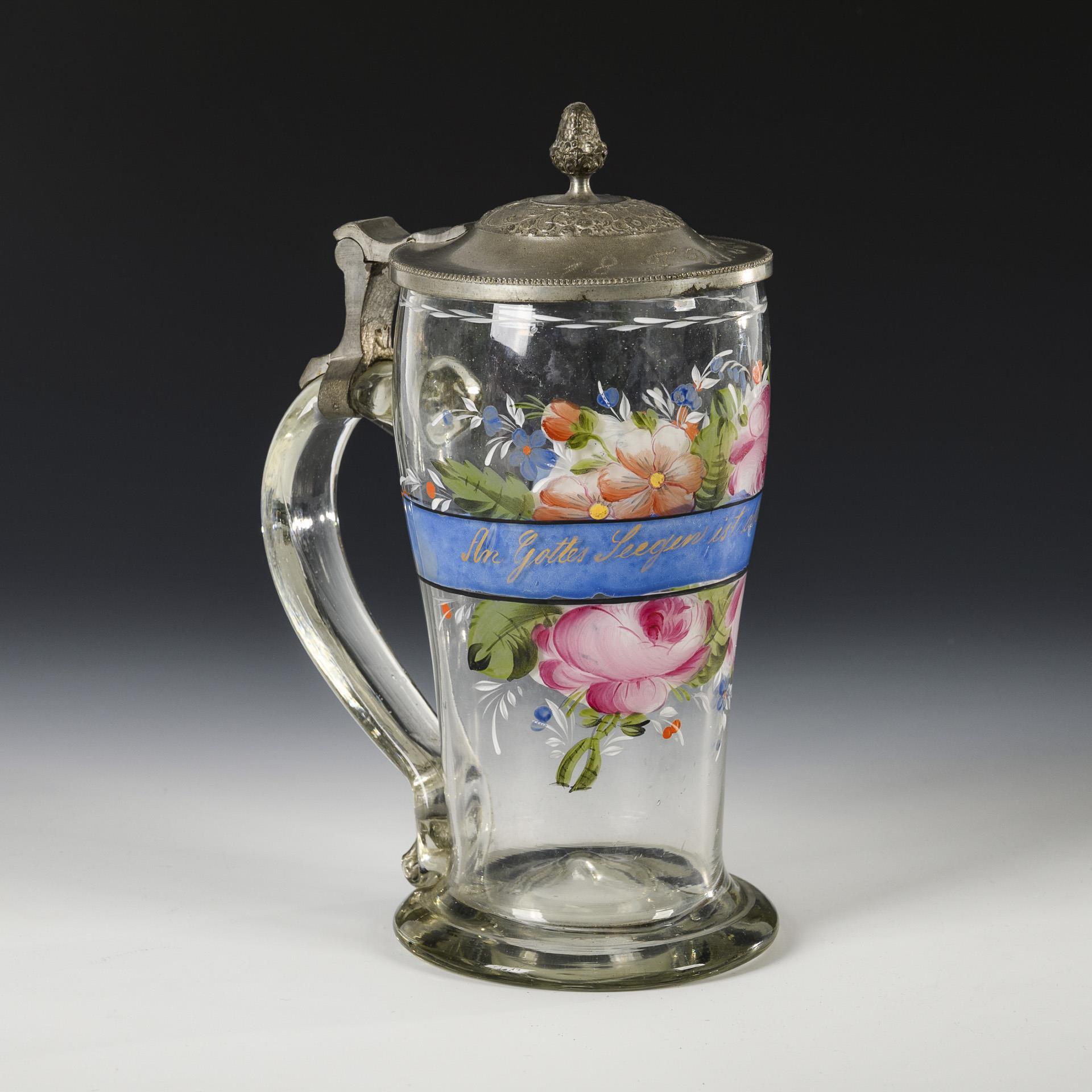 Body widening slightly towards the top, flared stand, ribbon handle and pewter-mounted hinged lid with the engraving "18 F W 61."; pontil mark. Between rose and forget-me-not blossoms a blue ribbon with the inscription "An Gottes Segen ist alles gelegen".