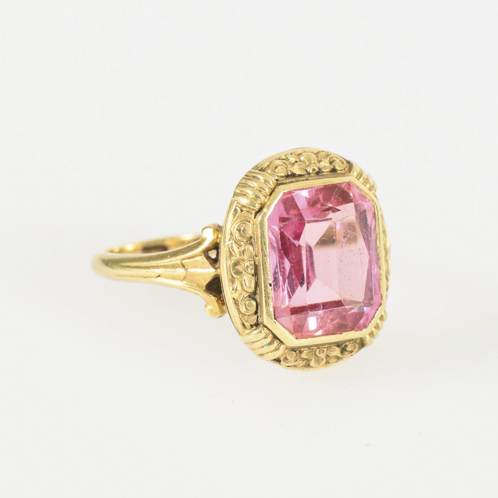 Ring with a bezel-set pale pink colored stone in a vegetal ornamented ring head between a narrow band. Slight signs of wear, minimal (0.20 mm) missing part at the setting, the stone holds securely.