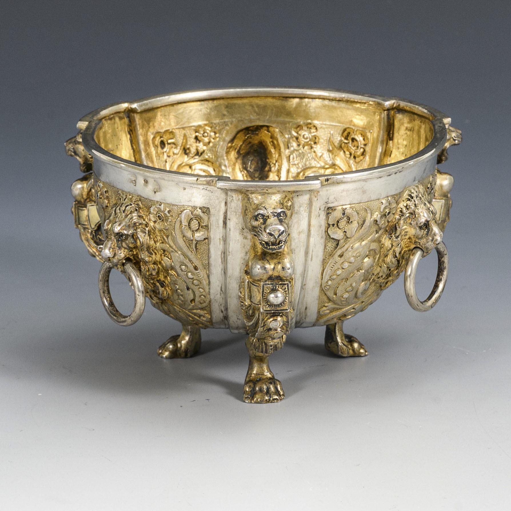 Round, richly reliefed bowl with lion heads and 3 ring handles, on paw feet.