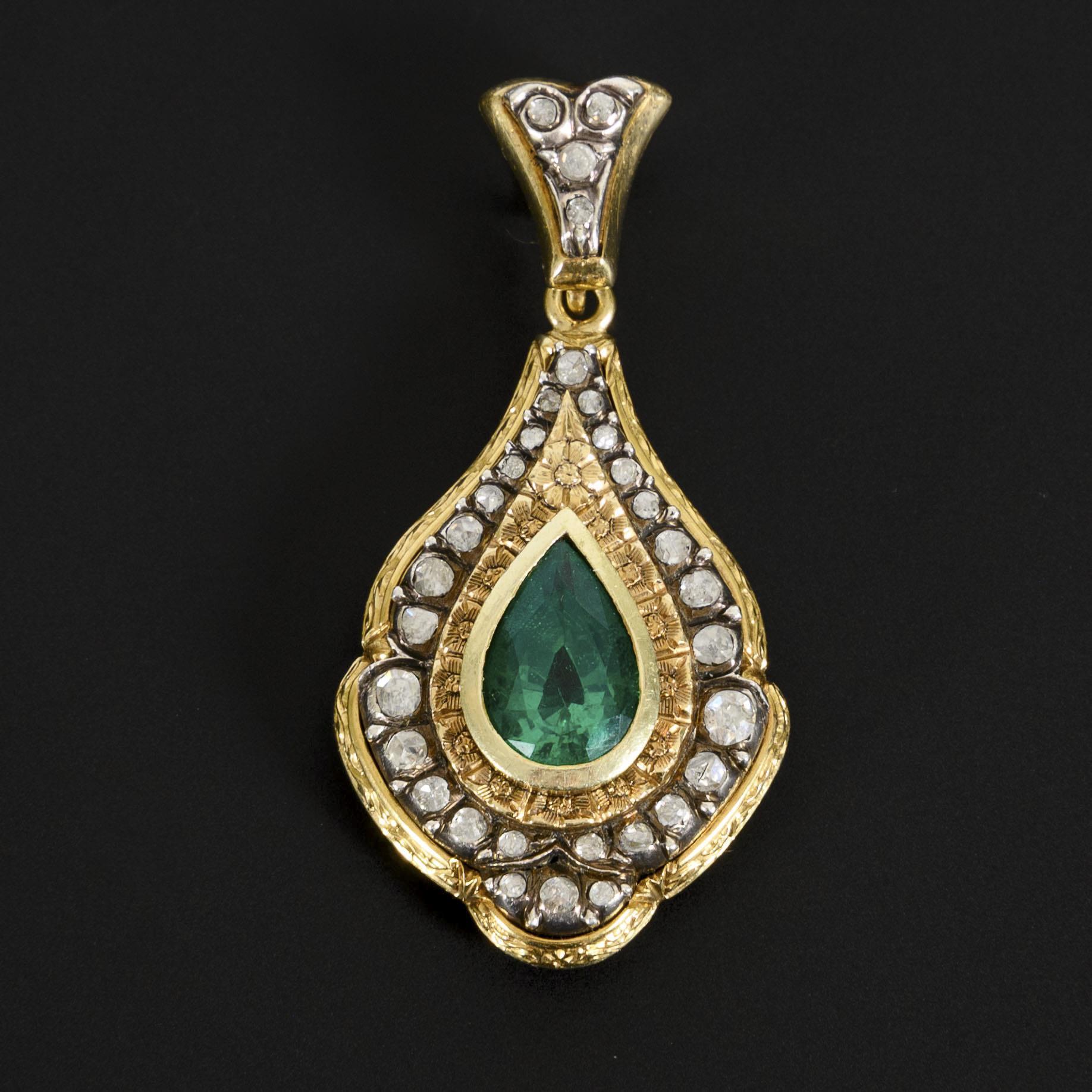 Historicizing pendant probably from the 1st half of the 20th century in the neo-renaissance style. In the center a bezel-set, drop-shaped emerald doublet, surrounded by diamond roses set in silver and engravings continuing on the back.