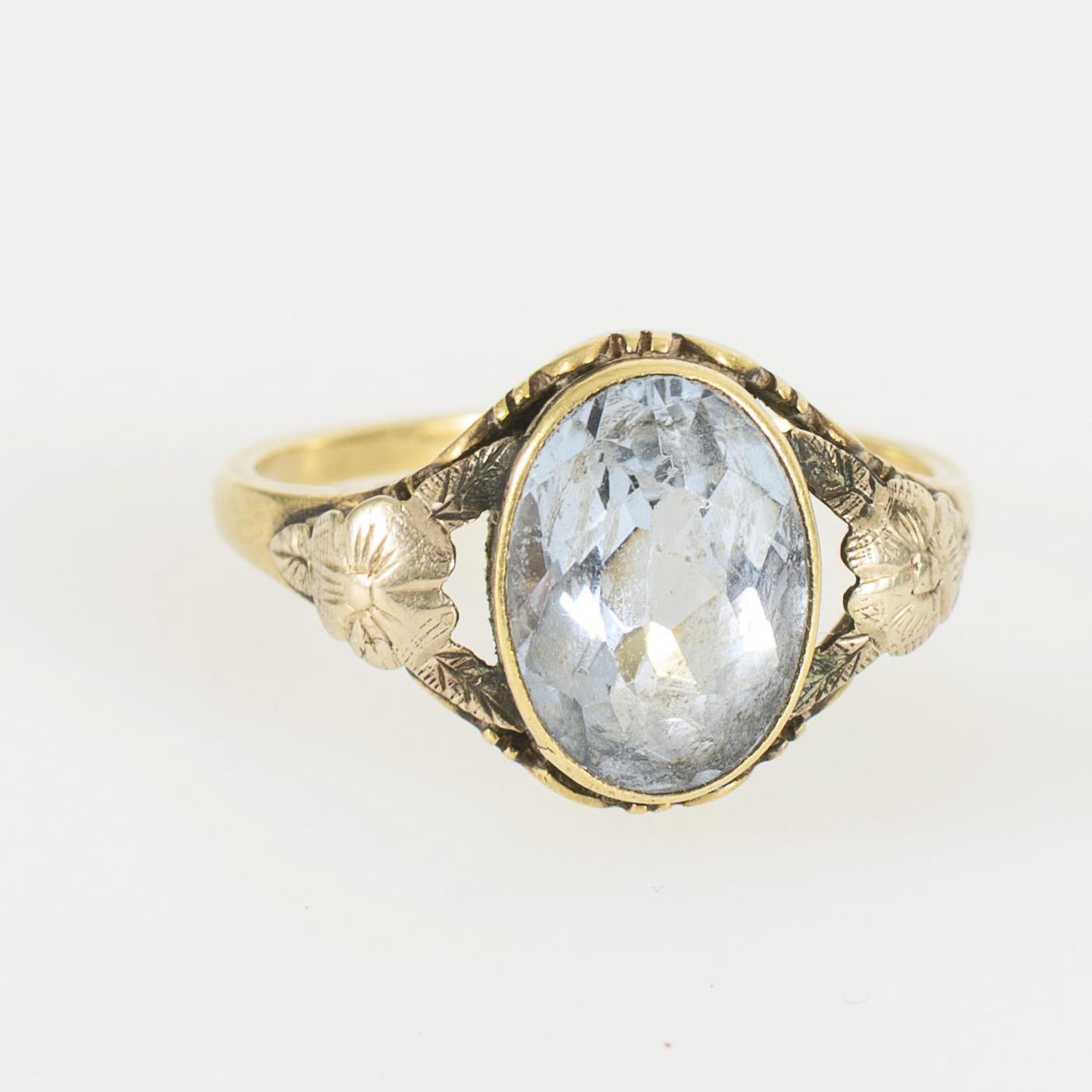 Older ring with a large, oval-faceted colored stone or corresponding synthesis, flanked by two delicate flower elements reminiscent of pansies with small leaves. Signs of wear to the ring and the cut edges of the stone, probably rubbed earlier fine gilding.