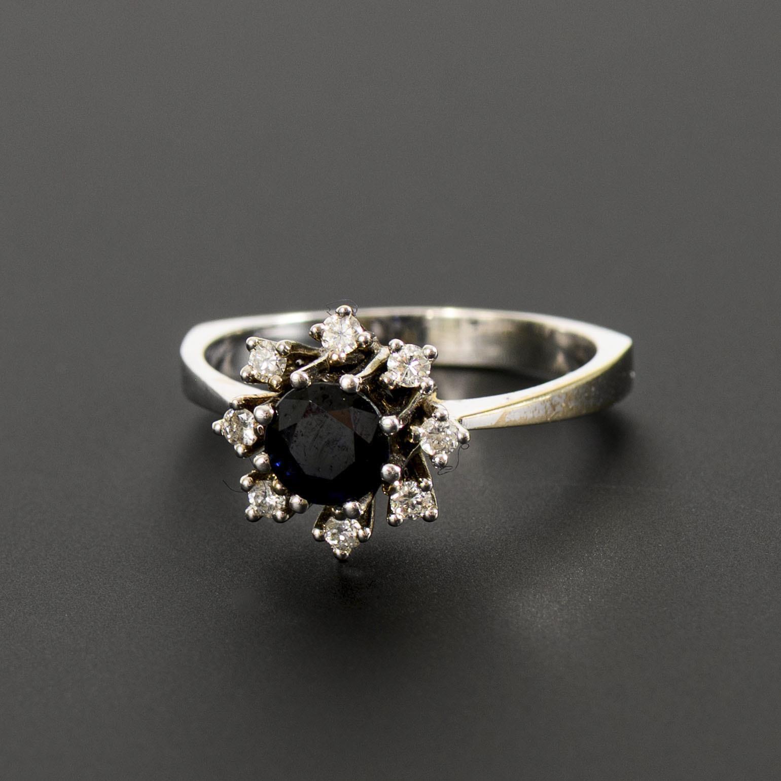 Ring with a central chaton-set blue colored stone, probably sapphire, flower-shaped surrounded by likewise chaton-set brilliant-cut diamonds. Slight signs of wear, especially on the underside of the ring band.