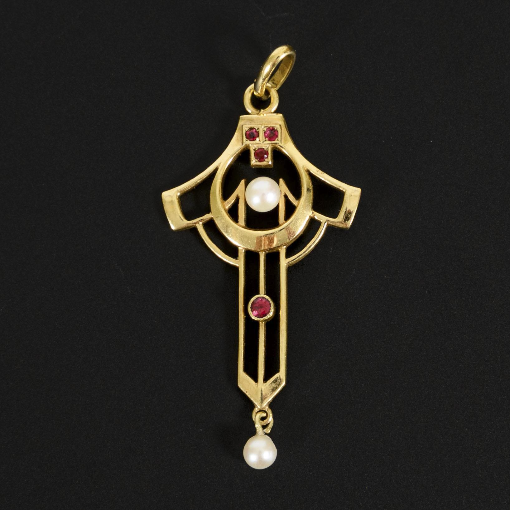 Art Nouveau pendant in a cross-shaped form, set with 4 red glass gemstones and 2 pearls, one of them as a suspension.
