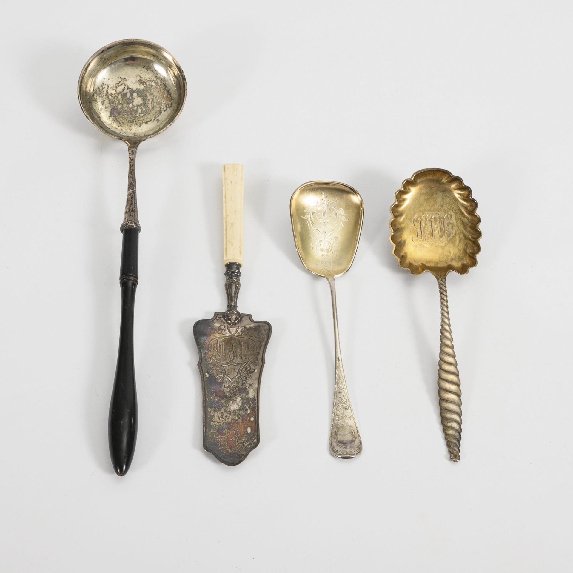 Flat ladle with wooden handle (13 lot), L 37 cm. / Cake server with leg handle (13 lot), l 26 cm. / Florally engraved spoon (800), l 22 cm. / American spoon with leaf-shaped bowl and engraved monogram (Whiting, New York/Sterling), l 23 cm. Some dents and repairs. Finial knob on the handle of the ladle missing.