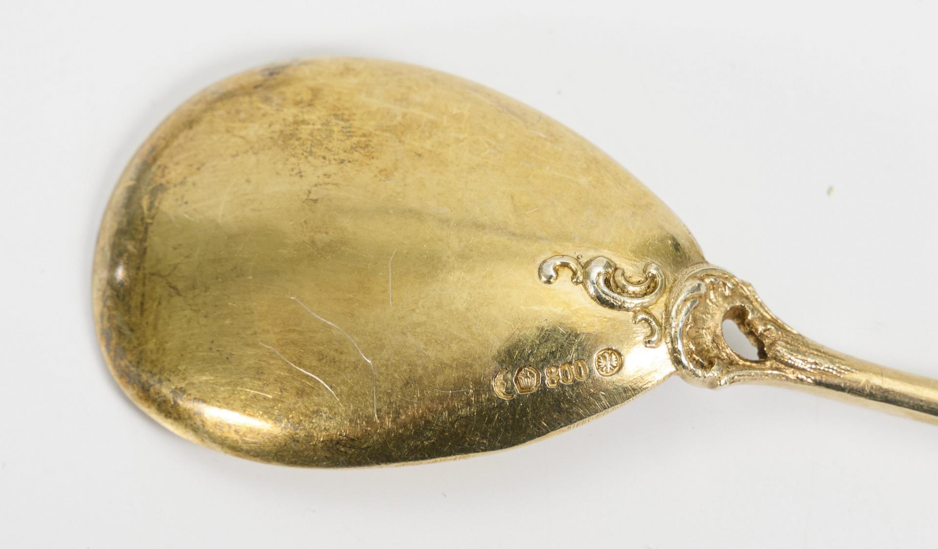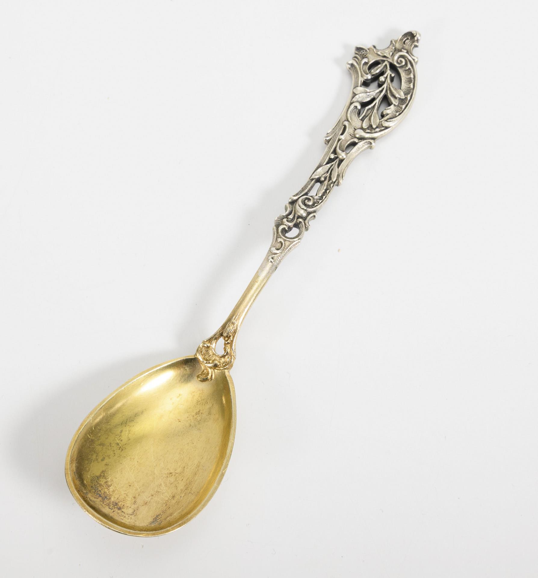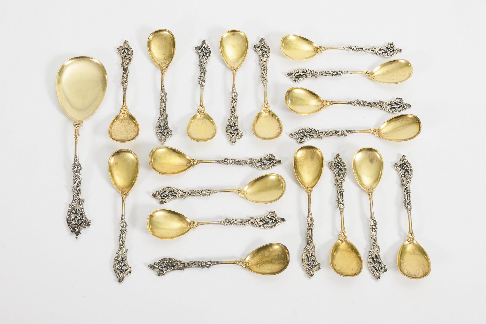 19 pieces. Gründerzeit-style relief and open-worked handles and gilded bowls: 1 serving spoon and 18 small ice cream spoons. Gold minimally rubbed.