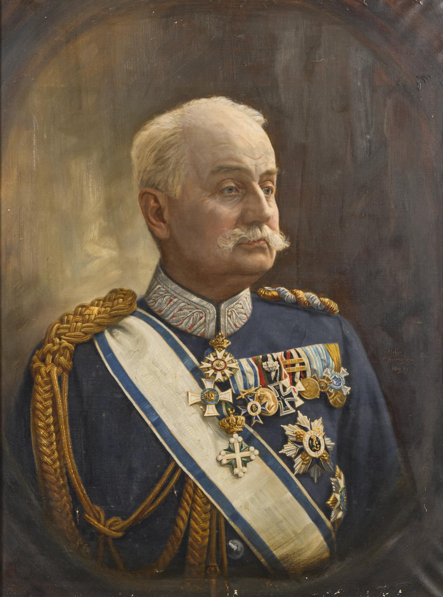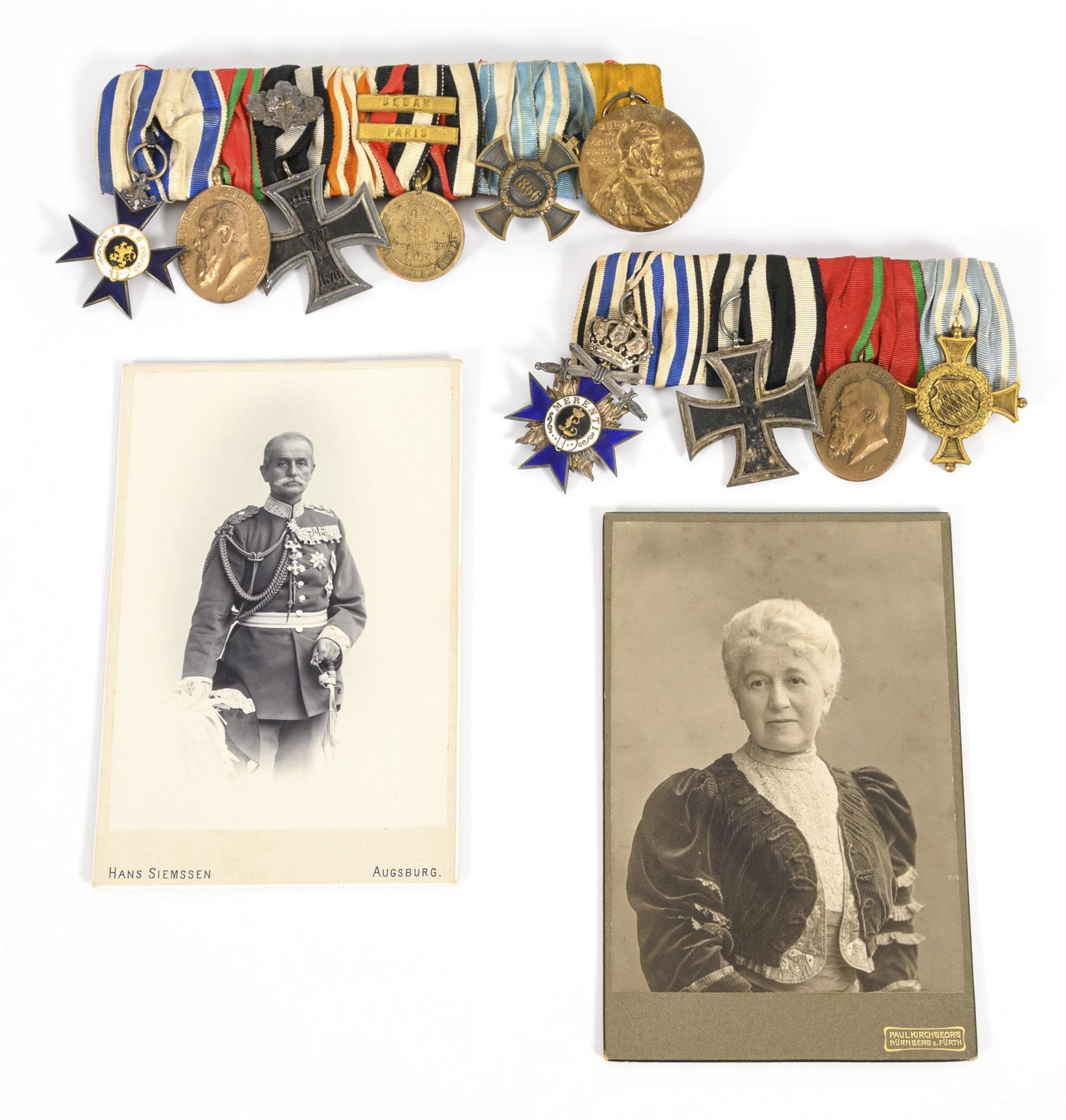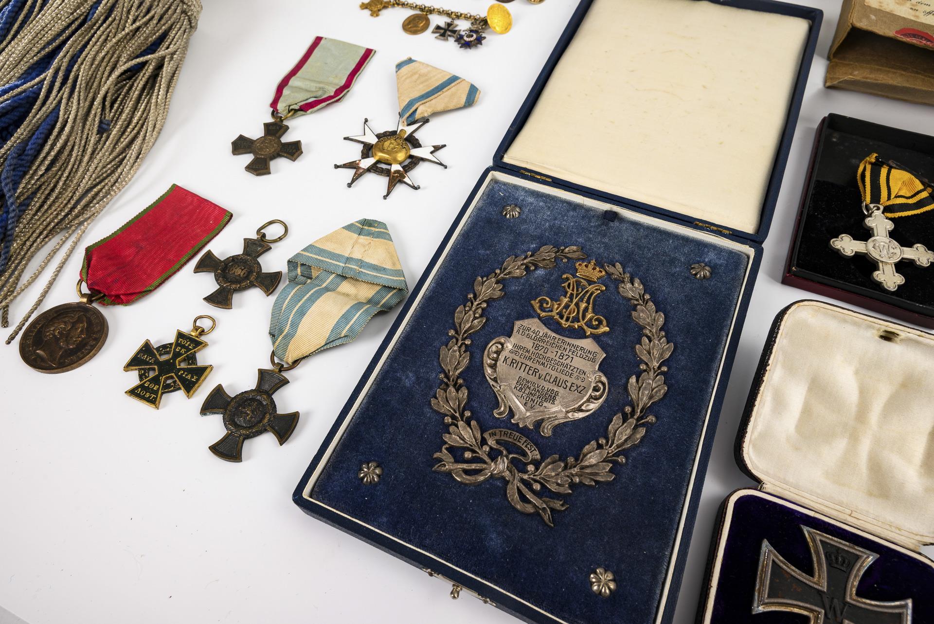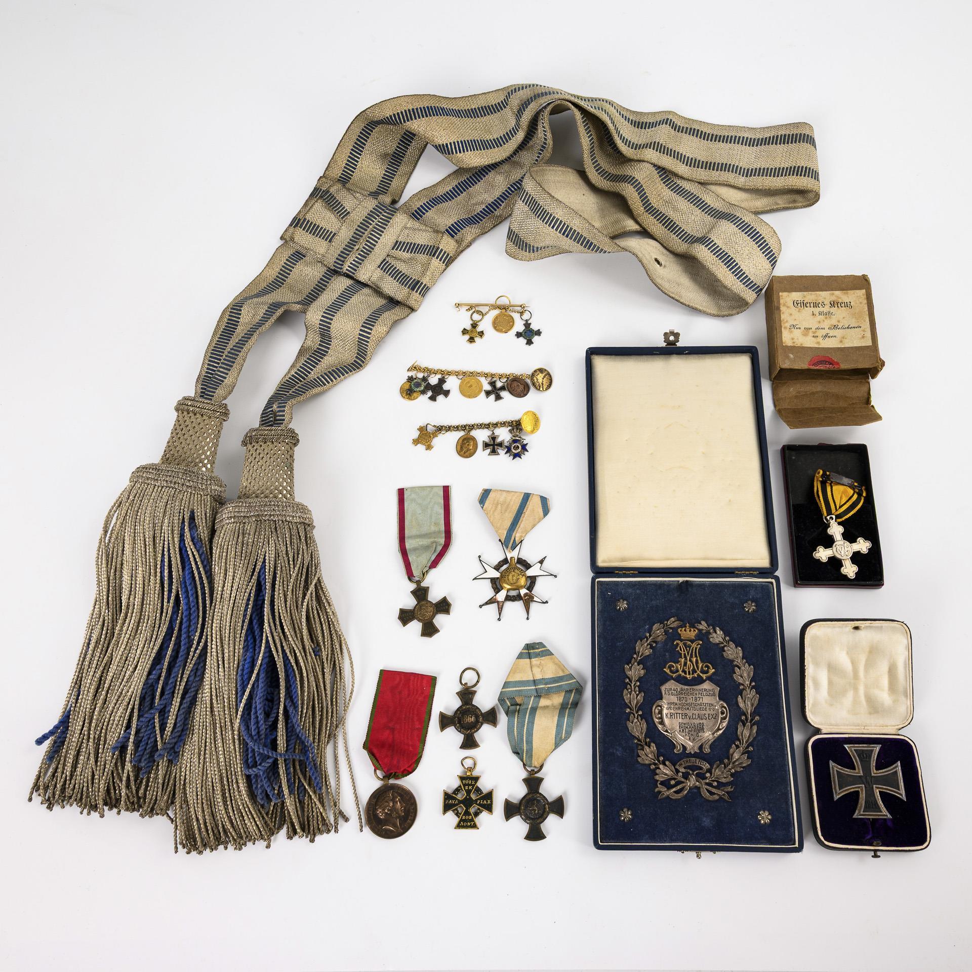 Carl Claus October 14, 1841 in Landau - December 19, 1914 in Nuremberg. Member of various regiments, 1890-93 colonel and commander of the 1st Bavarian Infantry Regiment 'König'. Very high quality overpainted photographic print of the richly decorated officer. Inscribed "Atelier P. Kirchgeorg Nbg. 09". Probably at the end of his career as lieutenant general of the Bavarian Army / Photo portrait as lieutenant general (photo studio Hans Siemssen, Augsburg) and photo of his wife (16.5 x 10.5 cm), / Honorary gift silver appliqué "Zur 40 Jähr. Commemoration of the glorious campaign 1870/71 ... K. Ritter von Claus Exz. ... dedicated by former members of the K.B. Inf. Regts. 'König' e.V." in casket, 16,5 x 12,5 cm. / Parade sash / Large medal clasp with 7 parts: Military Order of Merit (with missing obverse); Luitpold Medal; Iron Cross of1870 with jubilee oak leaves; Order of the Red Eagle (only ribbon present, destination according to painting); War Memorial Coin for fighters of 1870/71 with the battle clasps Sedan and Paris; missing part with blue and white ribbon: here possibly pendant similar to the memorial medal for the Bavarian relief corps in Greece (inscription slightly different, casting quality poor, colored overlaid on one side); campaign memorial medal 1866; Kaiser Wilhelm I. Commemorative medal 1897 / Small medal clasp with 4 parts: Order of Military Merit with crown and swords; Iron Cross 1914; Luitpold Medal; service award for 24 years / 2 further campaign medals for 1866, one with ribbon / Iron Cross First Class, 1914, in original box and issue box. / Charlottenkreuz am Band, Württemberg 1916 in half casket / memorial medal for the year 1849 for military personnel of the time for loyalty during the revolution / veteran's medal for the campaigns 1790 - 1812 / 3 different tail chains for miniature medals / a Schlaraffenorden (?). . Some signs of age/use to the portrait and frame.