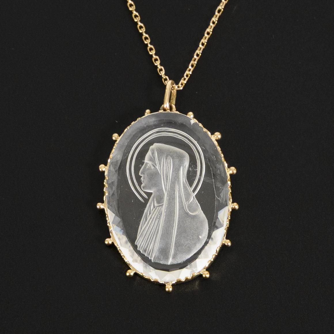 Mountain crystal pendant with intaglio depiction of the Virgin Mary, on chain.