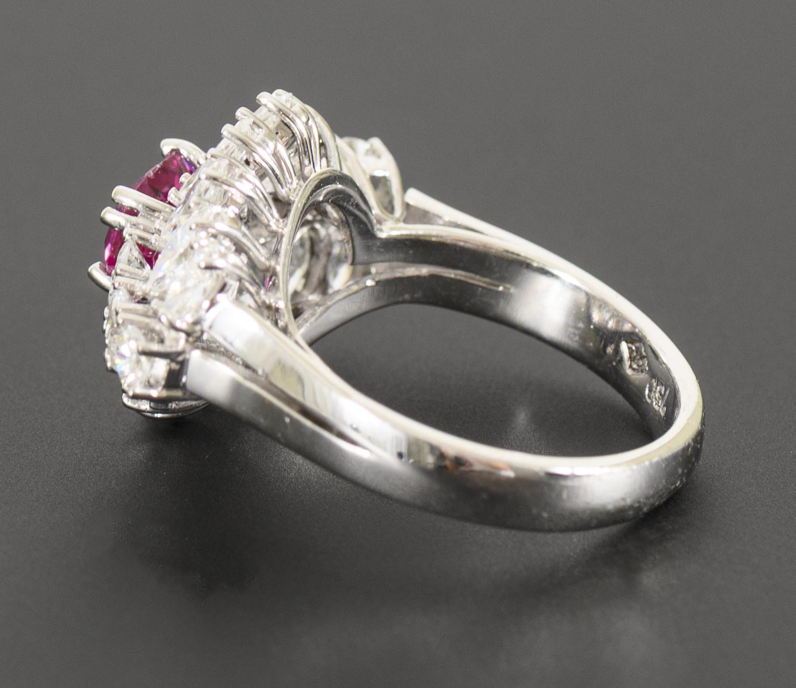 Hallmarked 750 white gold. Ring size 54.5, the ring head 21.6 x 13.7 mm, the ruby (measured in the setting) 6.32 x 5.20 x 3.58 mm, the diamonds together approx. 1.40 ct. 6.11 g.