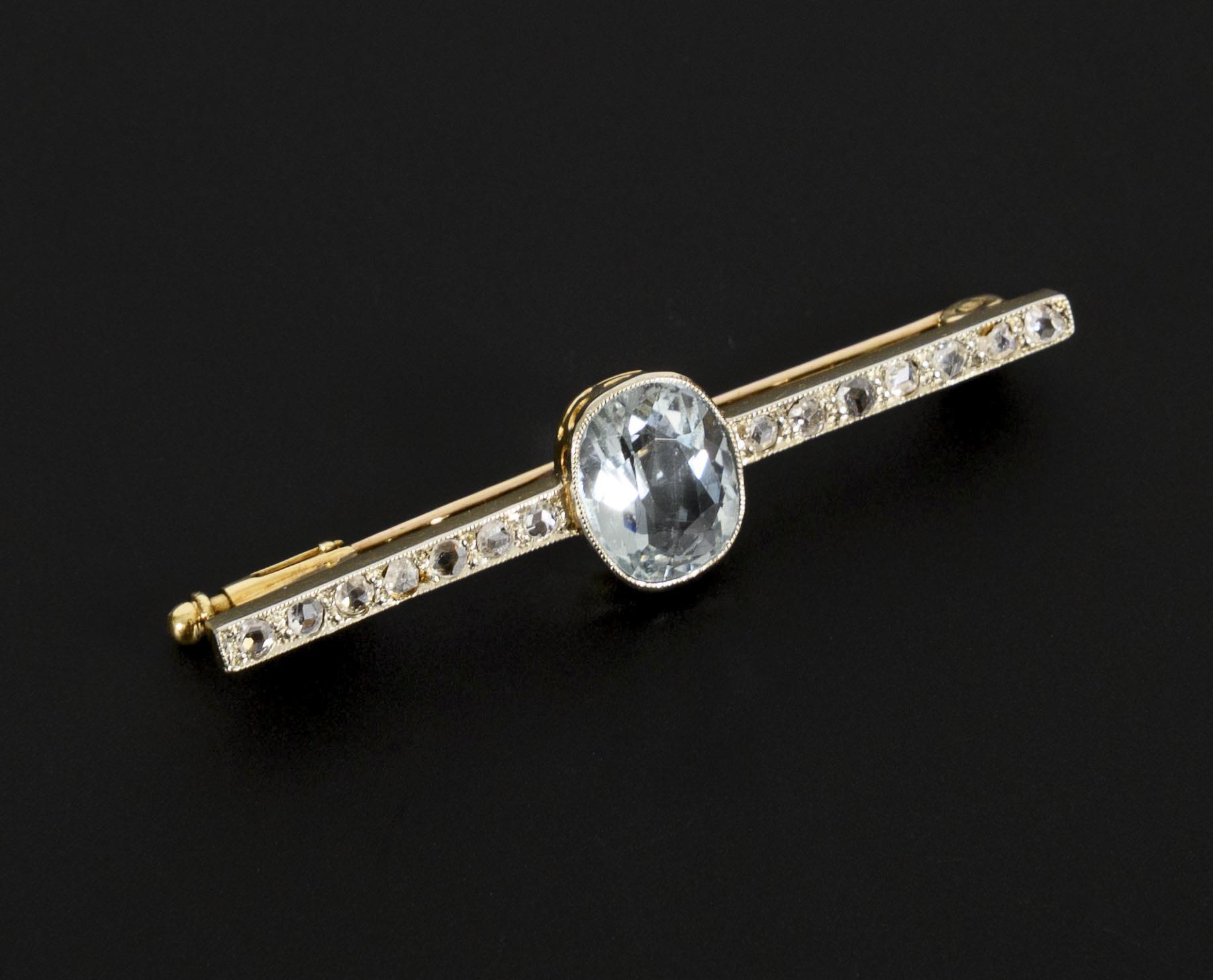 Bar brooch, probably around the turn of the century, with a bezel-set aquamarine between 7 rose-cut diamonds each, the setting decorated with millegriffes.