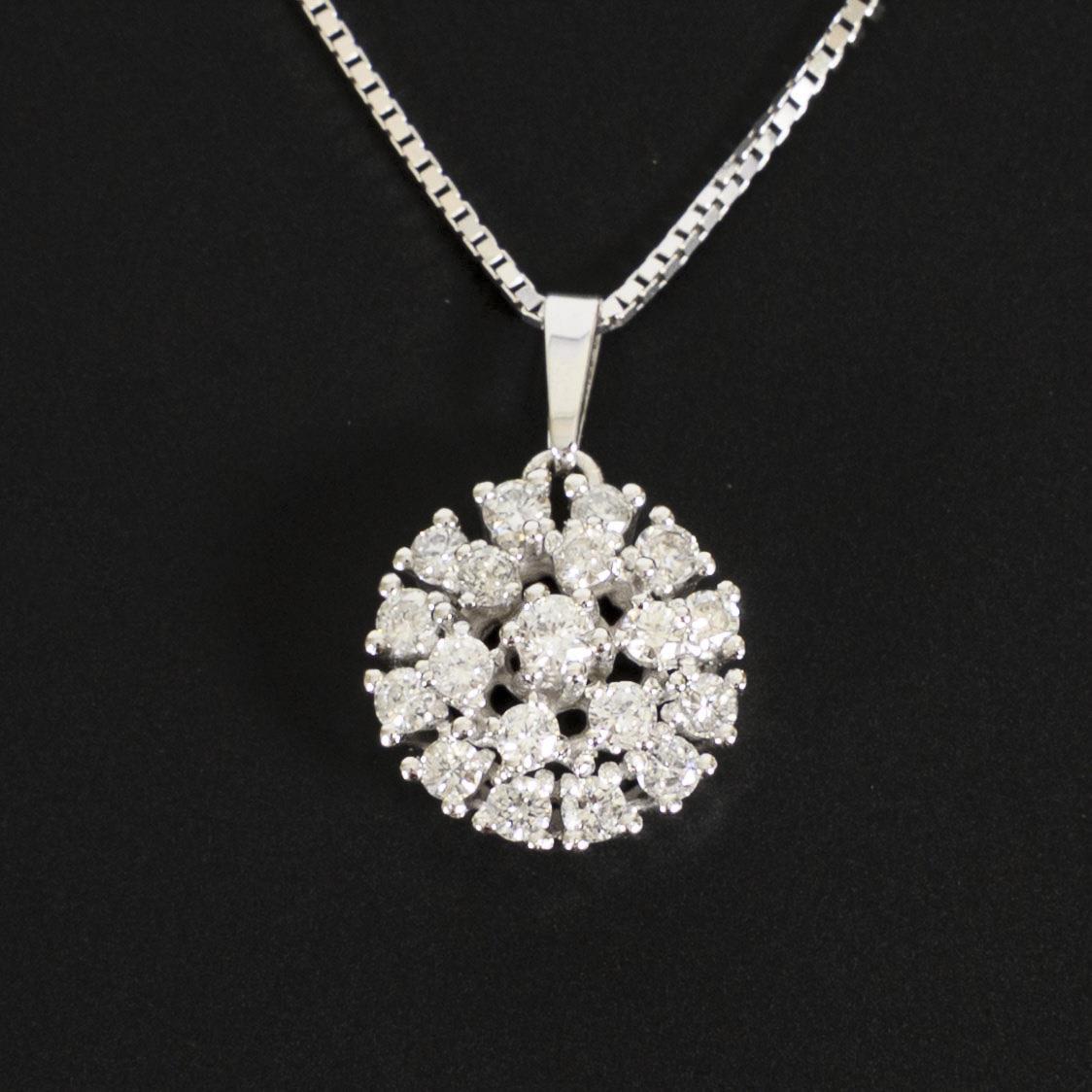 Round pendant, set with 19 chaton-set brilliant-cut diamonds in a terraced design, on a Venetian chain.