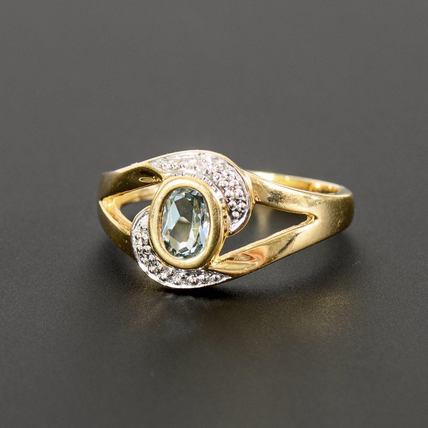 Ring with dividing yellow gold band and two-tone ring head, enclosing a light blue, bezel-set topaz.