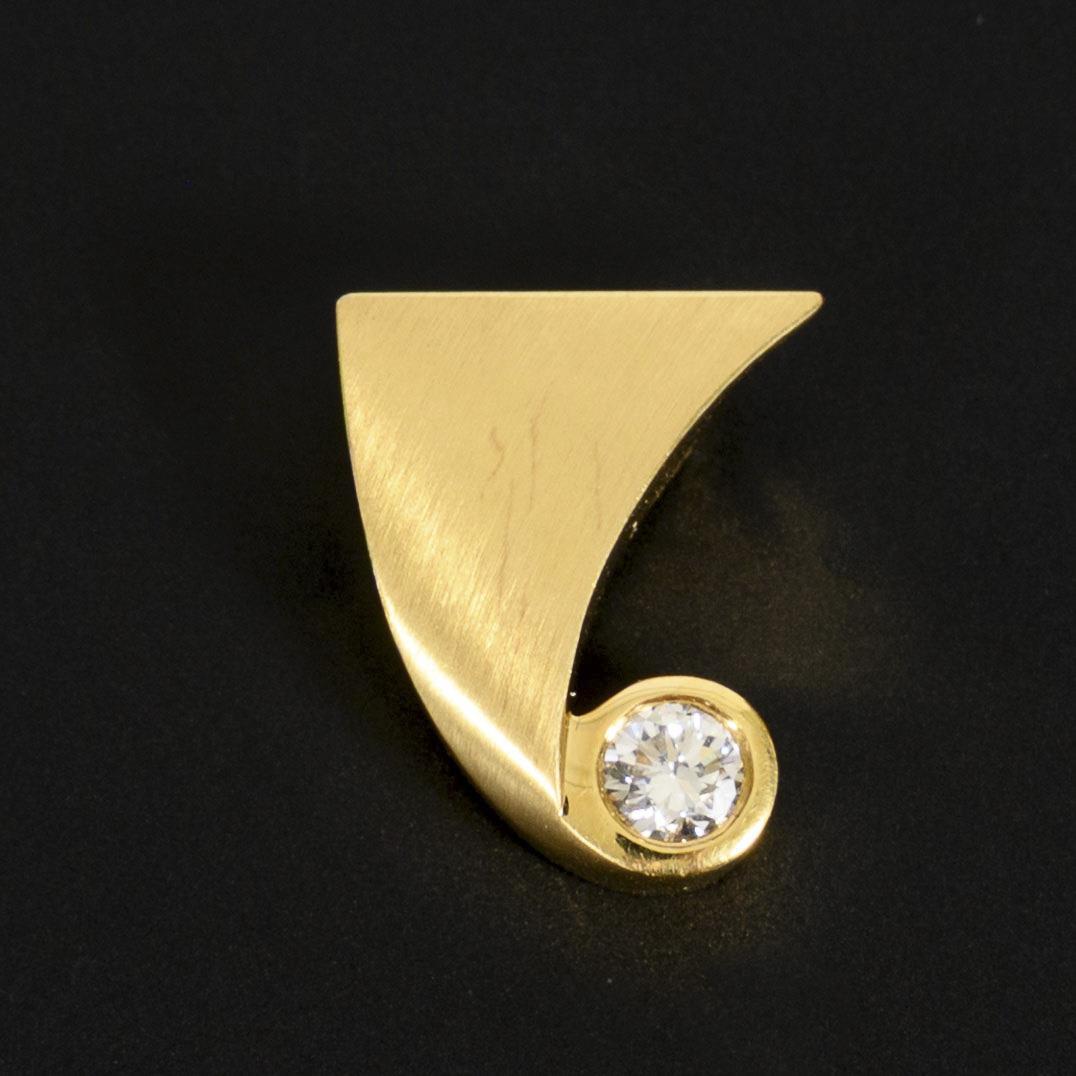 Modern pendant with a curved design, containing a bezel-set brilliant-cut diamond. On the back with 2 side eyelets incorporated into the design.