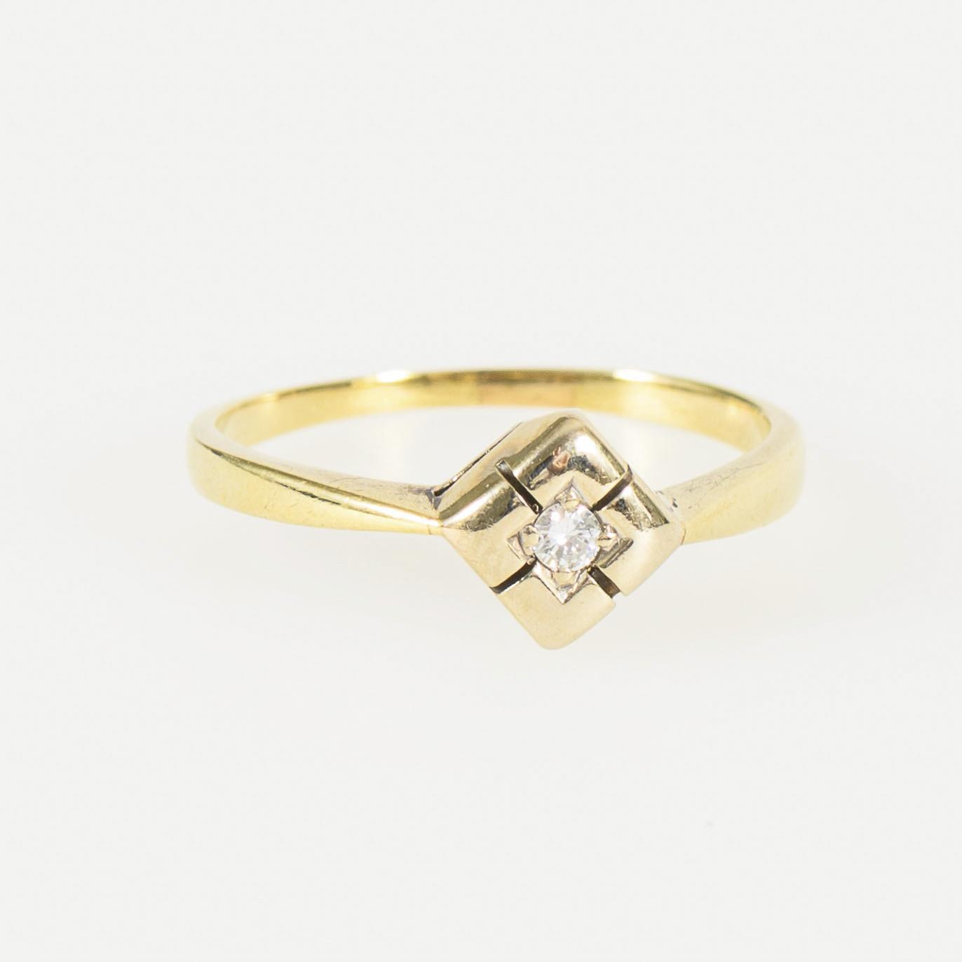 Between a delicate rail in yellow gold, a brilliant-cut diamond set into a diamond-shaped ring head in white gold.