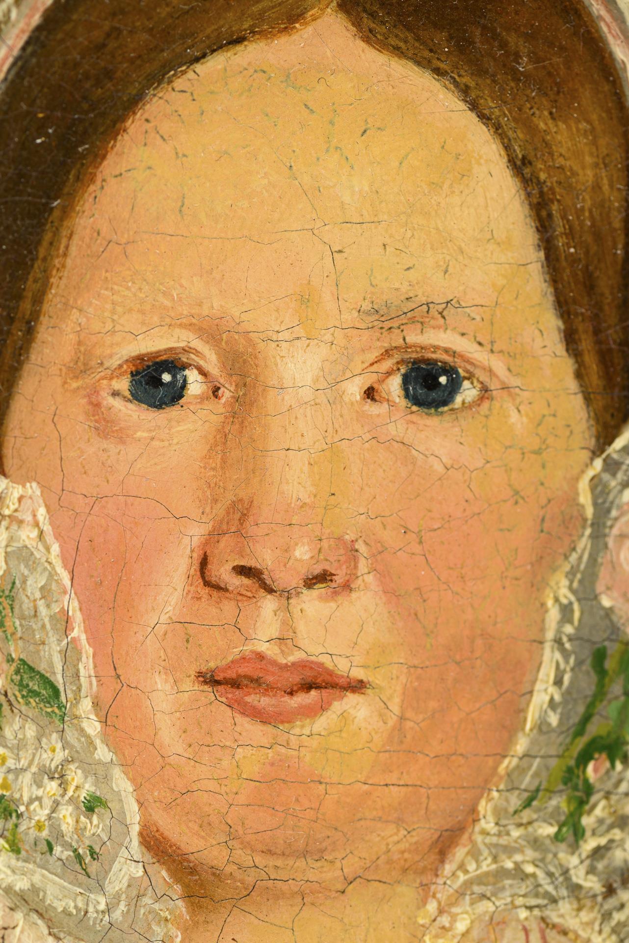 Portrait of a young woman in a black dress with a lace hood at a table set in green. Traces of age.