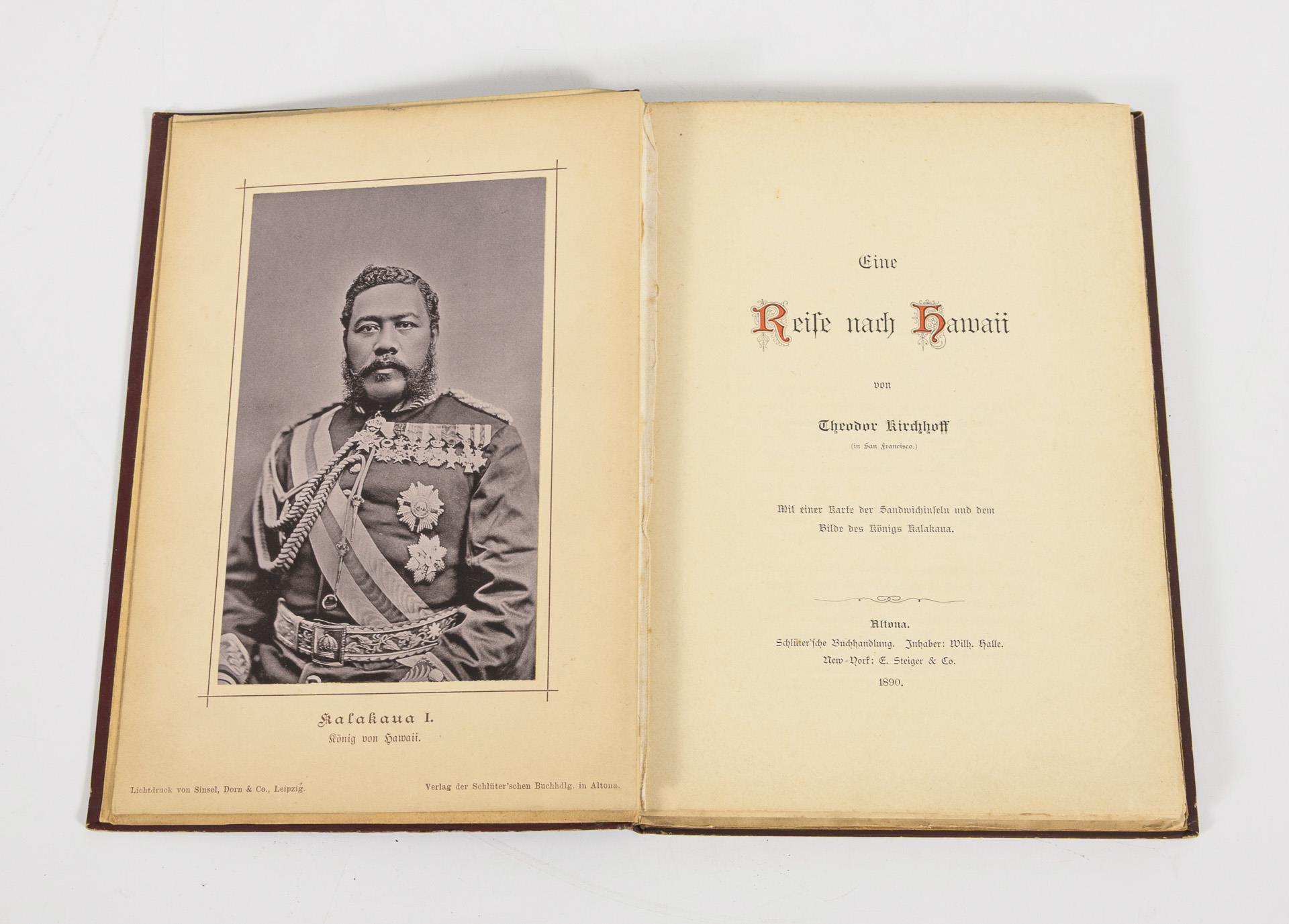 12, 199 pages, with a map of the Sandwich Islands and the picture of King Kalakana (loose), in color cardboard binding, block not trimmed.