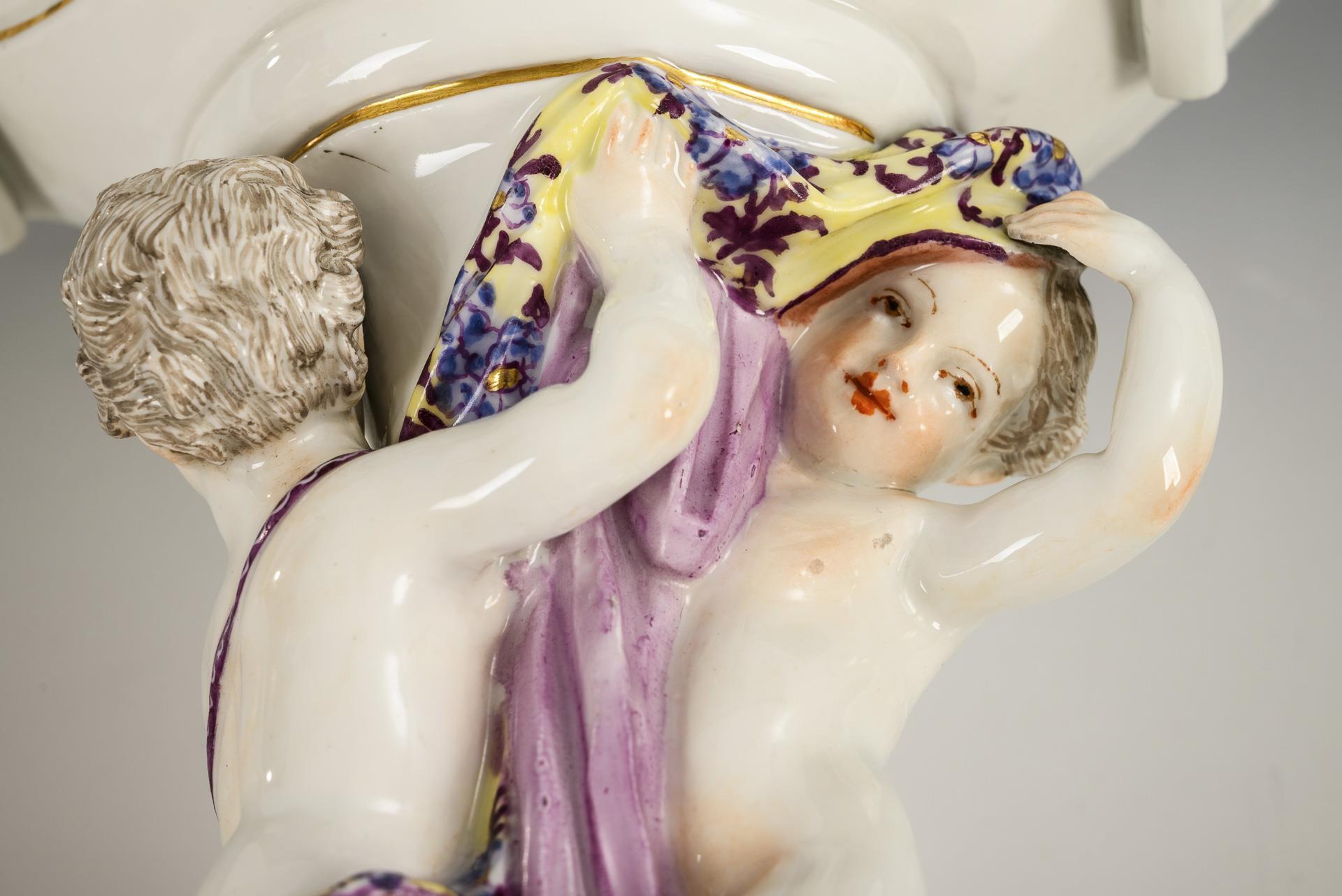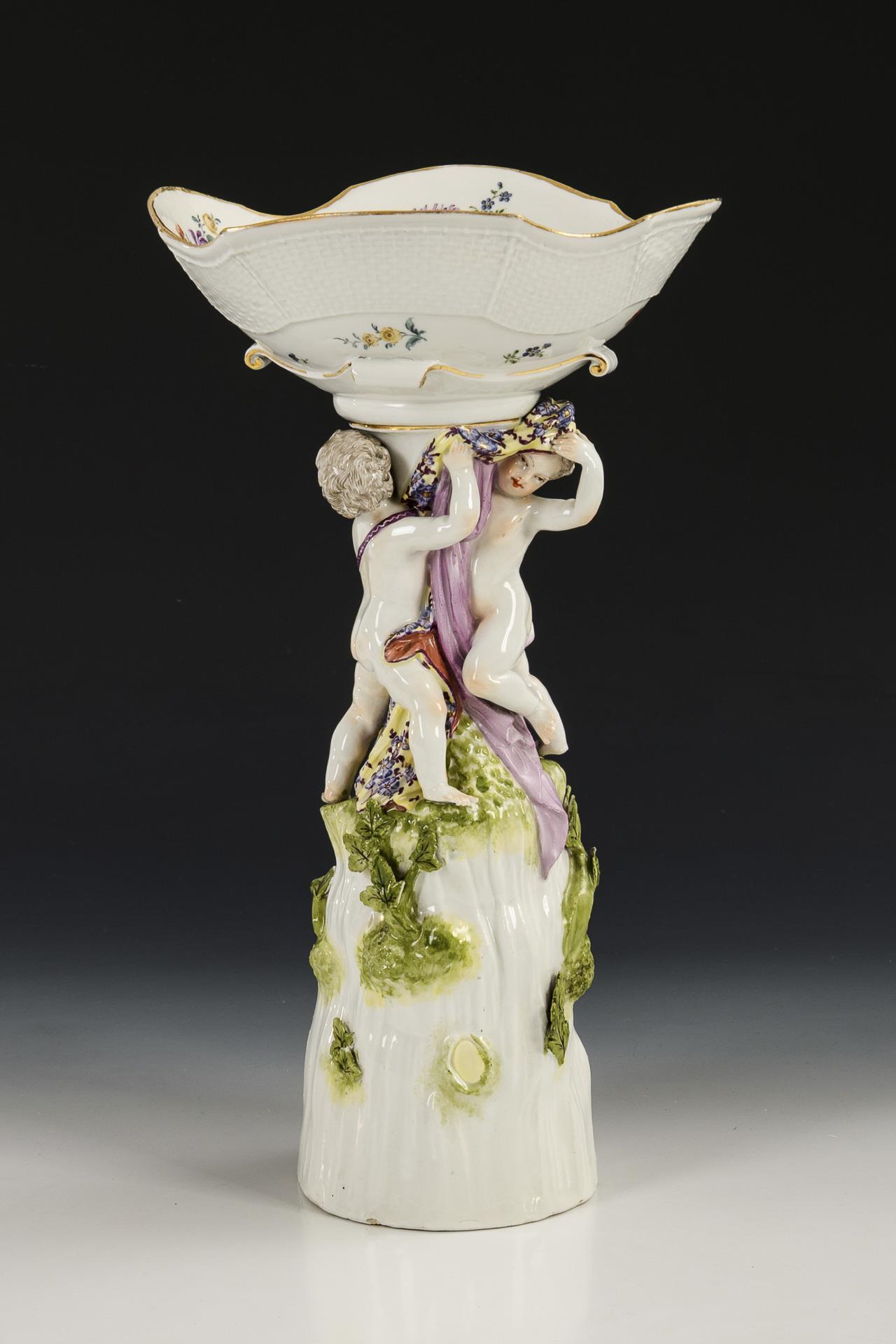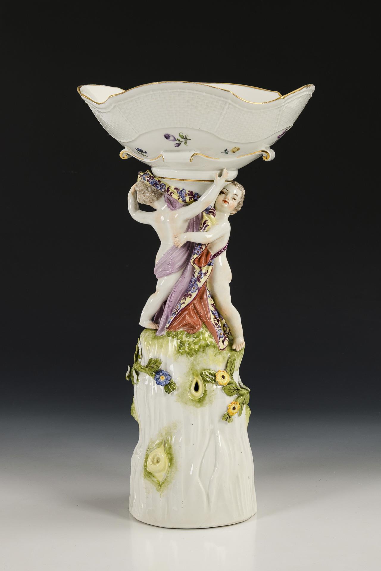 Shaft of two putti standing on a tree stump, carrying a quatrefoil bowl with alto-decorated relief and flower painting. Some leaves chipped.