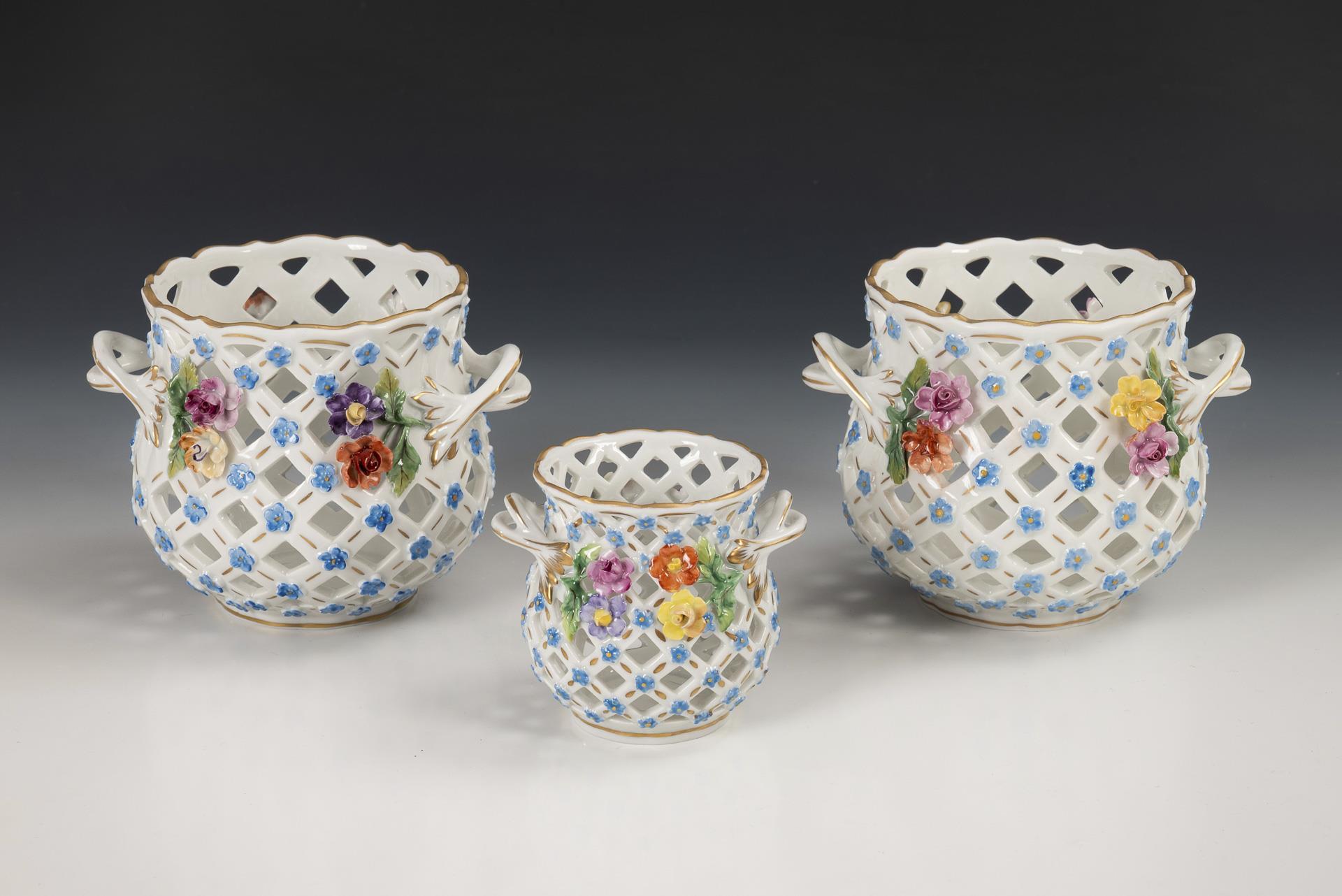 Cachepots worked as baskets with forget-me-not blossoms in relief and applied flowers. 1 blossom chipped.
