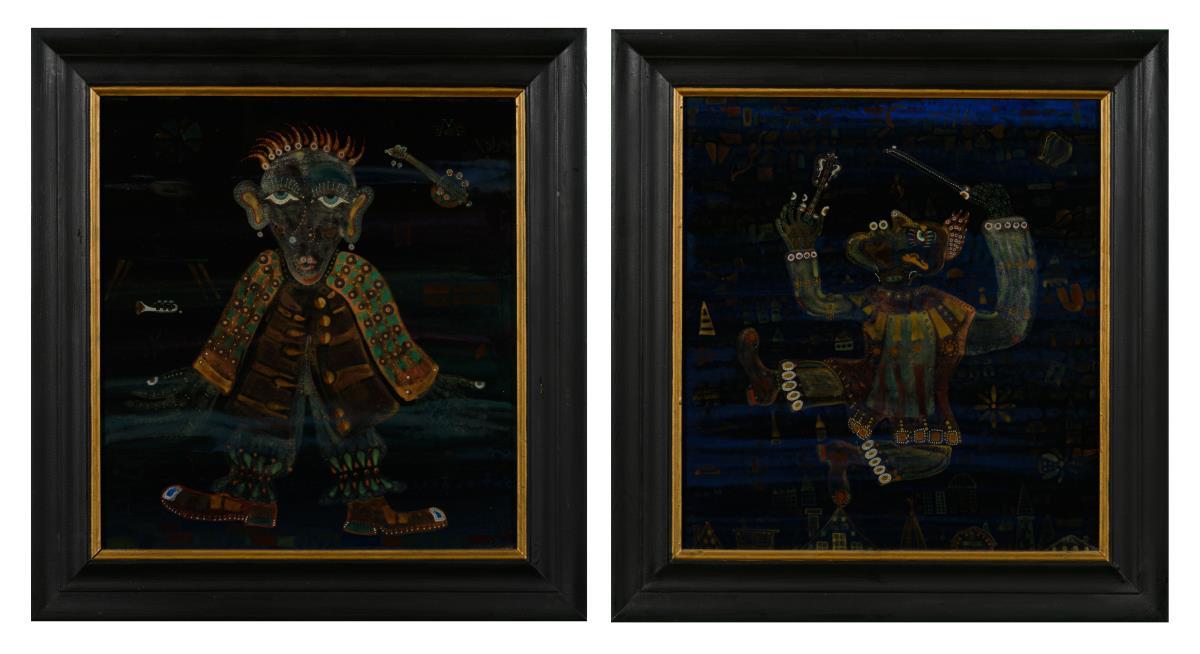ESCOT, Maurice (*1948 Ehrenbreitstein) "Der Geigenspieler" und "Und...das ist alles was ich habe" Je Hinterglasmalerei. Links bzw. rechts oben monogrammiert, je verso bezeichnet/betitelt. Je datiert: (19)79. Je 37 x 34 cm. Gerahmt & hinter Glas: Je 47 x 44 cm. Darstellung zweier abstrakter Figuren mit Musikinstrumenten..