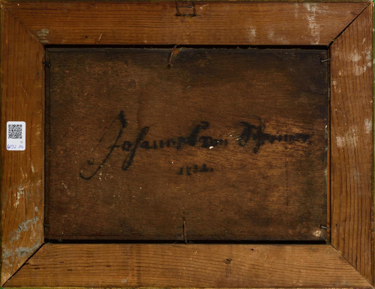 Landschaftsmaler 18. Jh.: Landschaft mit Vieh und zwei sich prügelnden Männern Öl/Holz. Unsigniert, verso undeutlich bezeichnet. Verso datiert: 1788. 17 x 25,5 cm. Gerahmt: 26 x 34 cm. Keilerei zwischen zwei Männern am seichten Fluss, daneben die Tiere und Blick in die weite Landschaft. Reinigungsbedürftig..