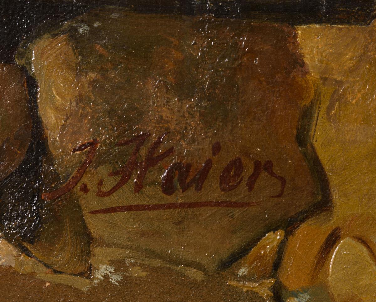 HAIER, Josef (1816 Wien - 1891 Brünn) Der erste Schnee Öl/Leinwand. Österreich. Links signiert. 100 x 74 cm. Gerahmt: 133 x 108 cm. Vater mit den beiden erstaunt in die Natur blickenden Kindern vor der Haustür im Neuschnee. Leinwand doubliert. Genremaler, studierte in München. Nicht verfügbar. Versand Nicht verfügbar..