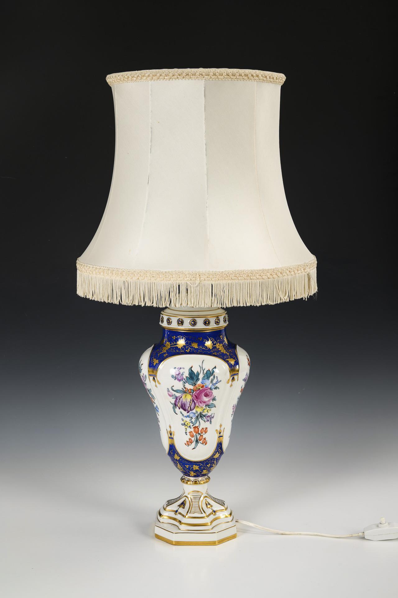 Baluster lamp base on an octagonal plinth, with gold vine leaf painting on a royal blue partial background, depicting a bouquet of flowers on all sides. White, original fabric shade. Electrified (function not tested).