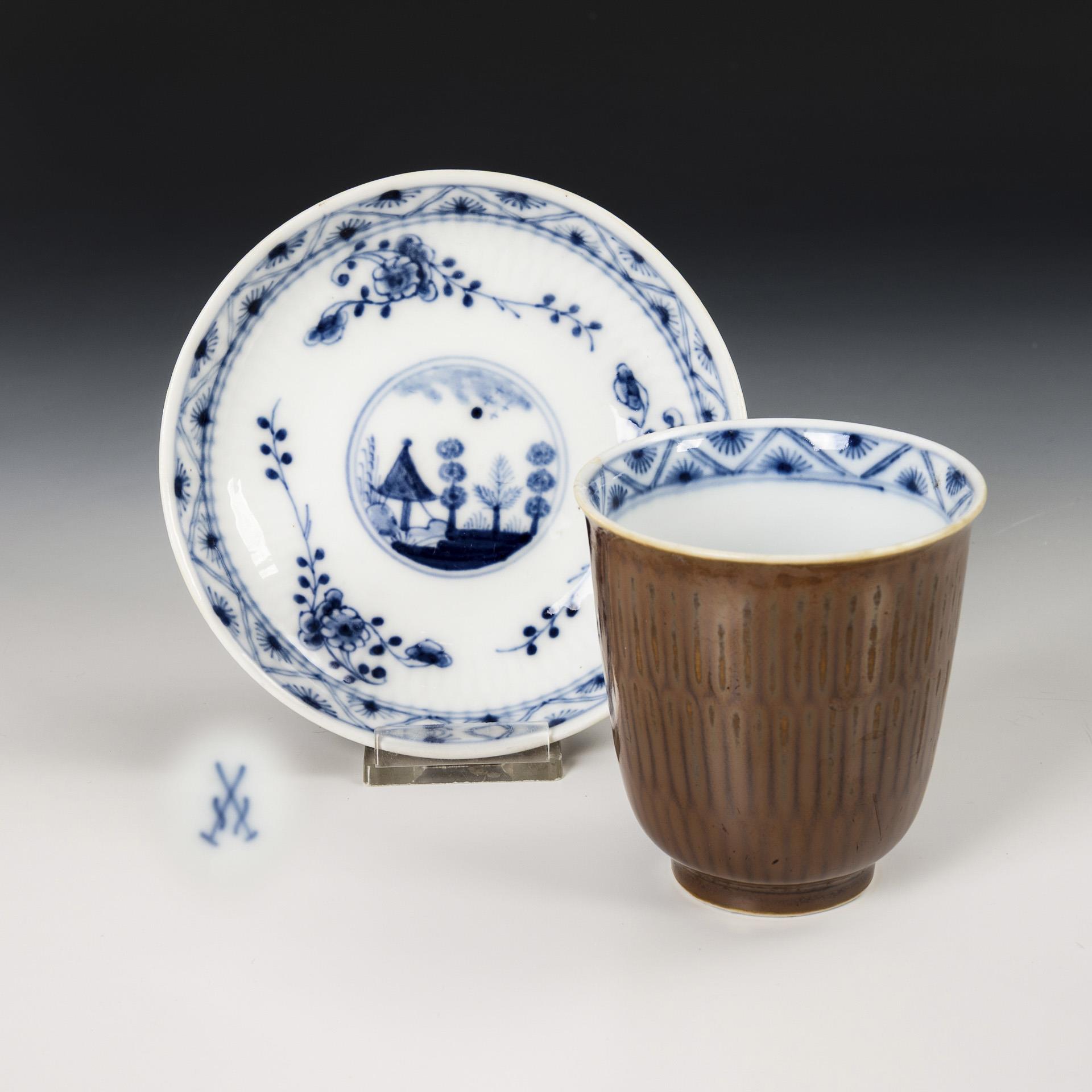 "Broken stick" shape. Brown wall background, geometrically patterned border in underglaze blue, in the mirror of the saucer a medallion with a Chinese landscape with pavilion.