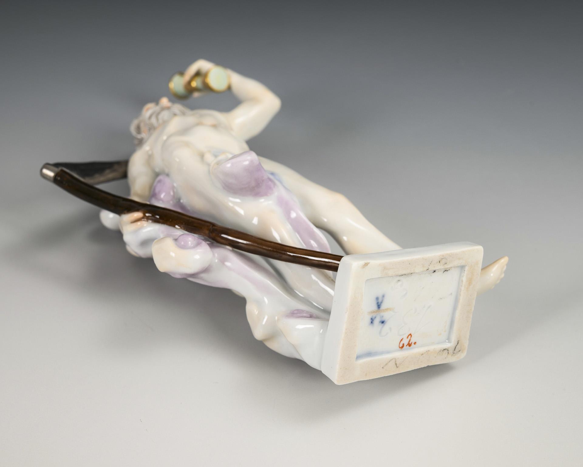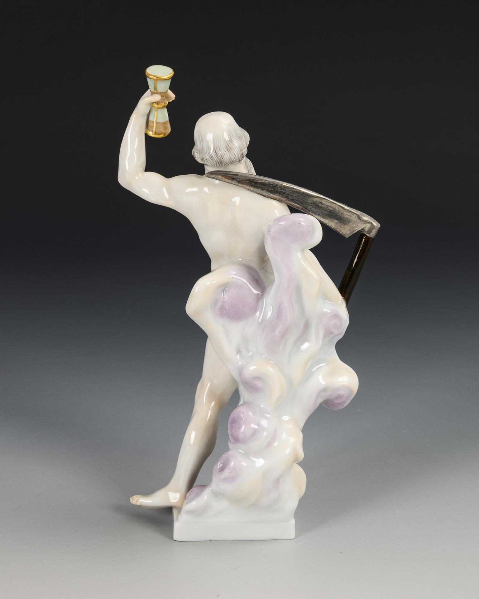Personification of Time standing on a cloud with hourglass and scythe. Scythe handle restored.