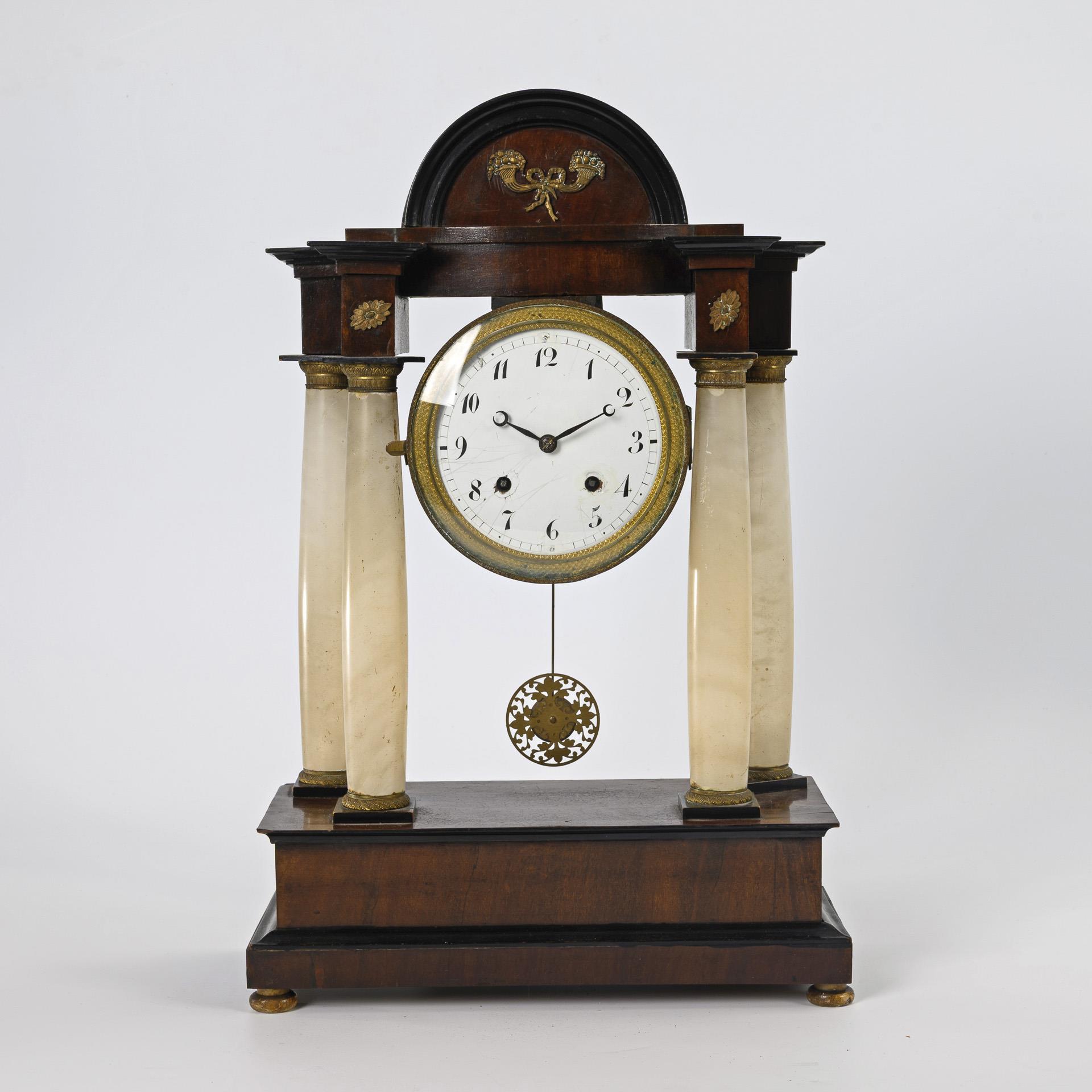 Classical portal clock with arched pediment, 4 alabaster columns and simple stepped base, on 4 disc feet. Brass fittings with flowers and cornucopias. Signs of age and wear, defects, crowning missing. Restoration recommended.