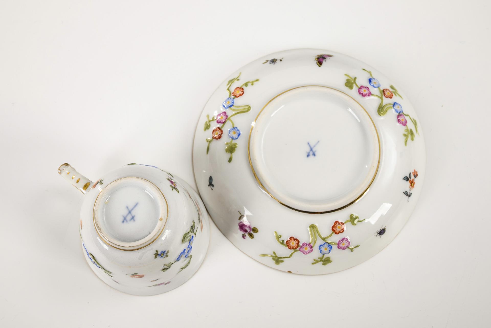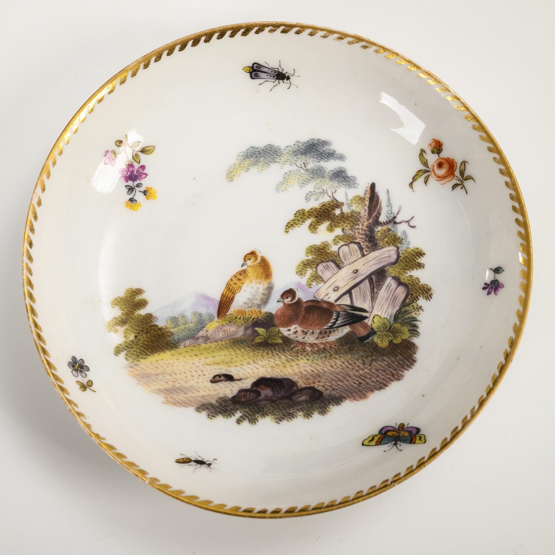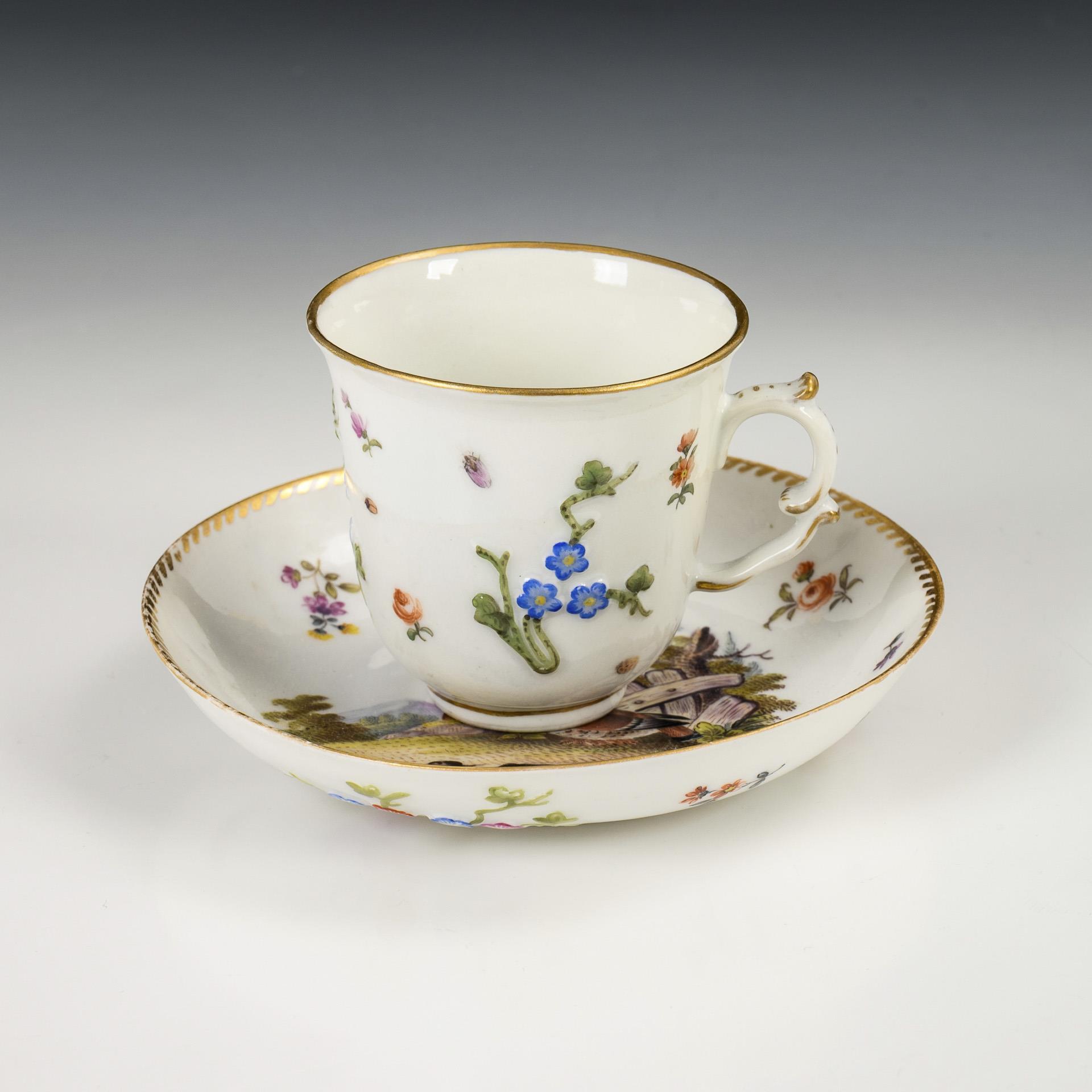 Bell-shaped cup with rocaille handles and applied floral branches on the wall. Scattered flower and insect painting on the cup, poultry painting on the saucer. Cup restored.