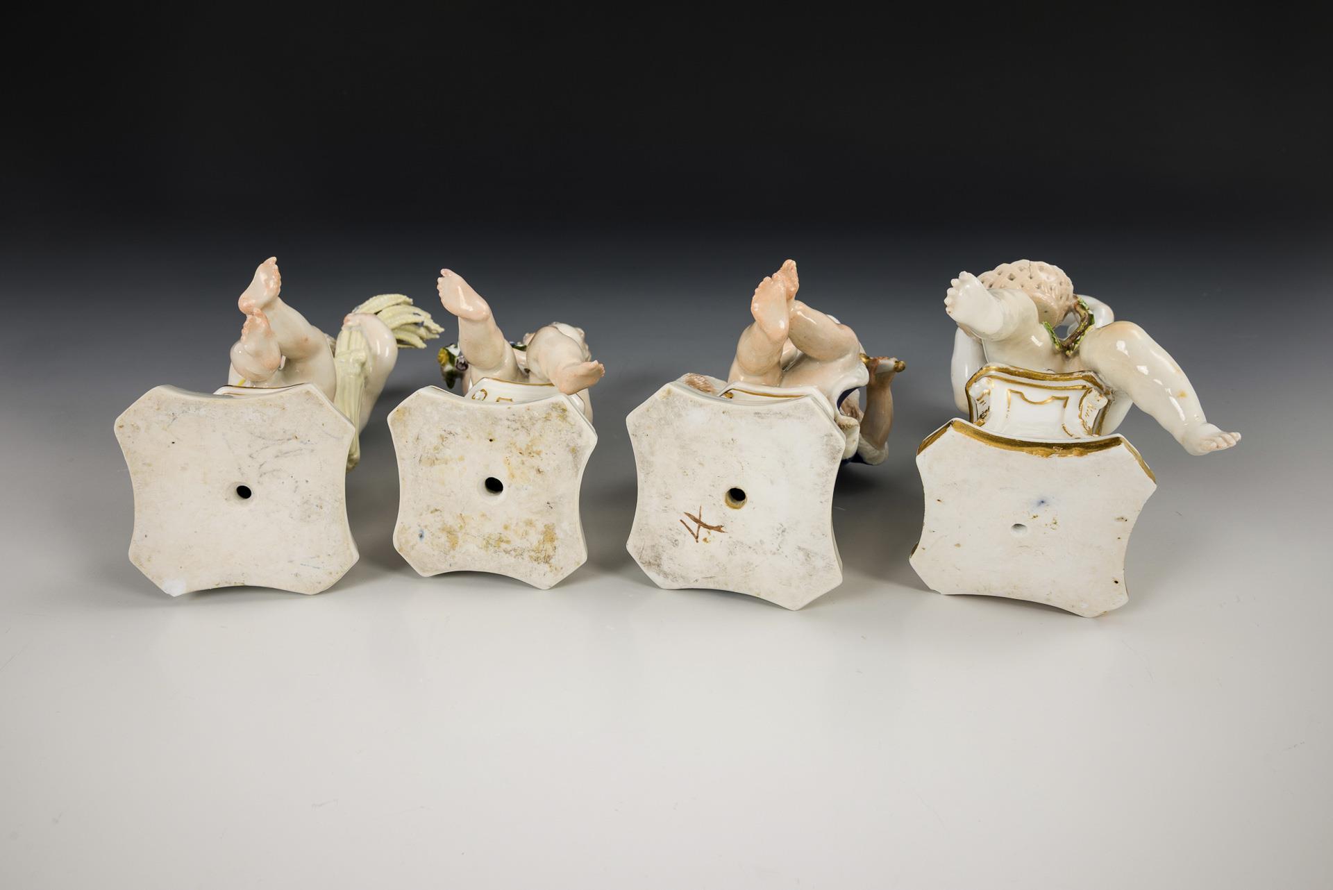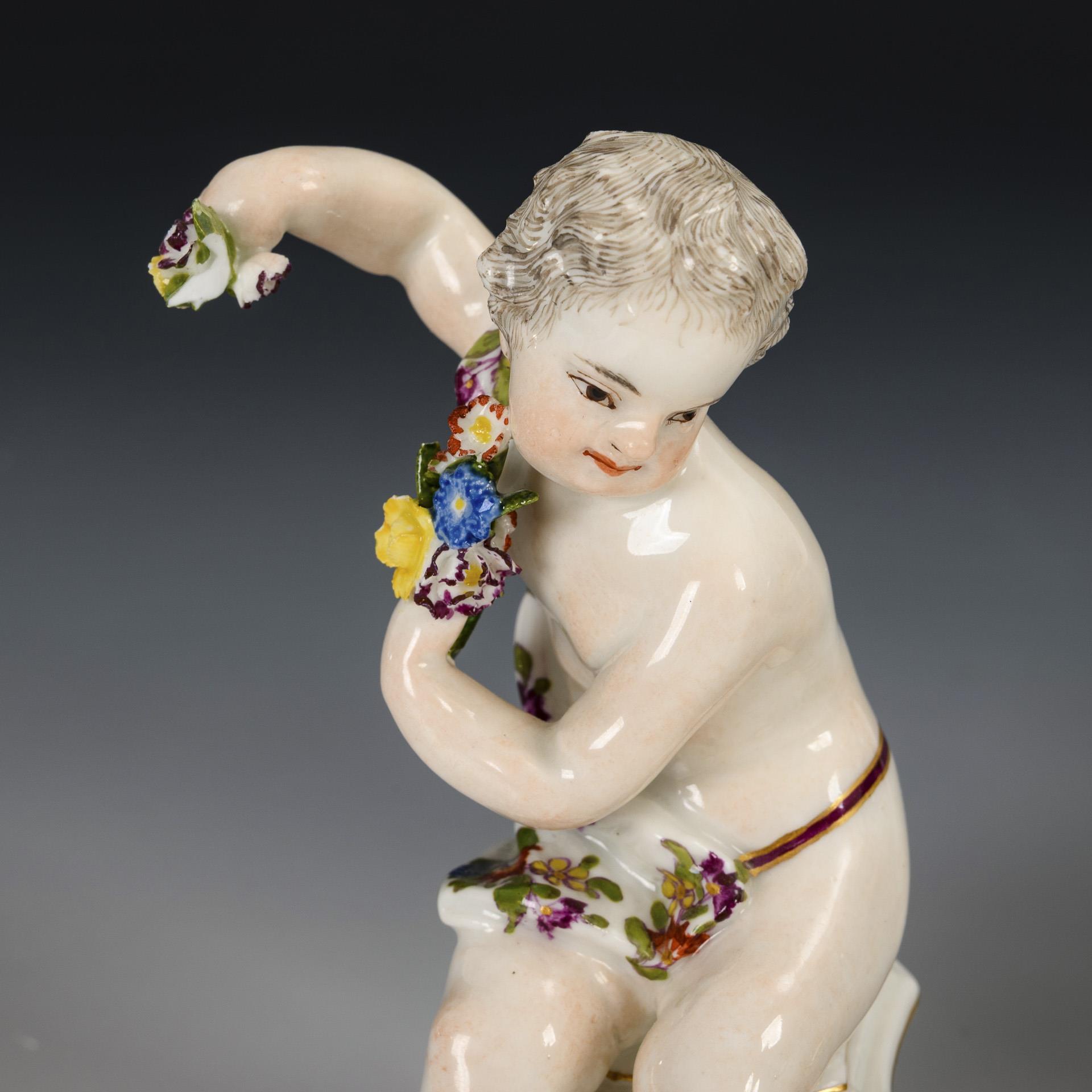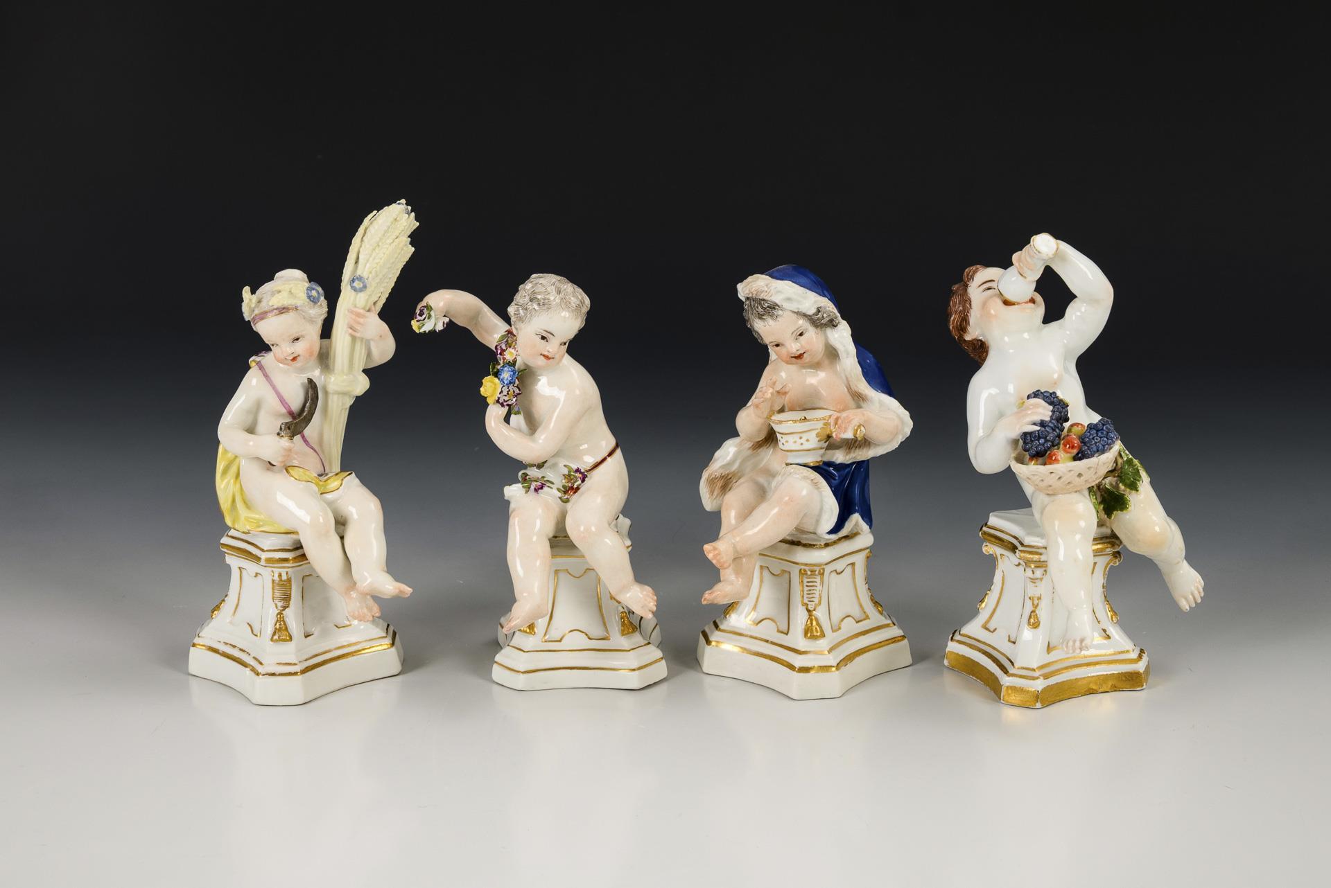 Each seated on a plinth: putto with bouquet of flowers (spring), putto with sheaf and sickle (summer), bacchanalian boy with fruit and wine cup (autumn) and putto with fire bowl and cloak (winter). Spring: 1 bouquet of flowers chipped; summer: 3 ears of corn chipped; autumn: both legs restored, some vine leaves chipped; winter: Fingers of the right hand restored.