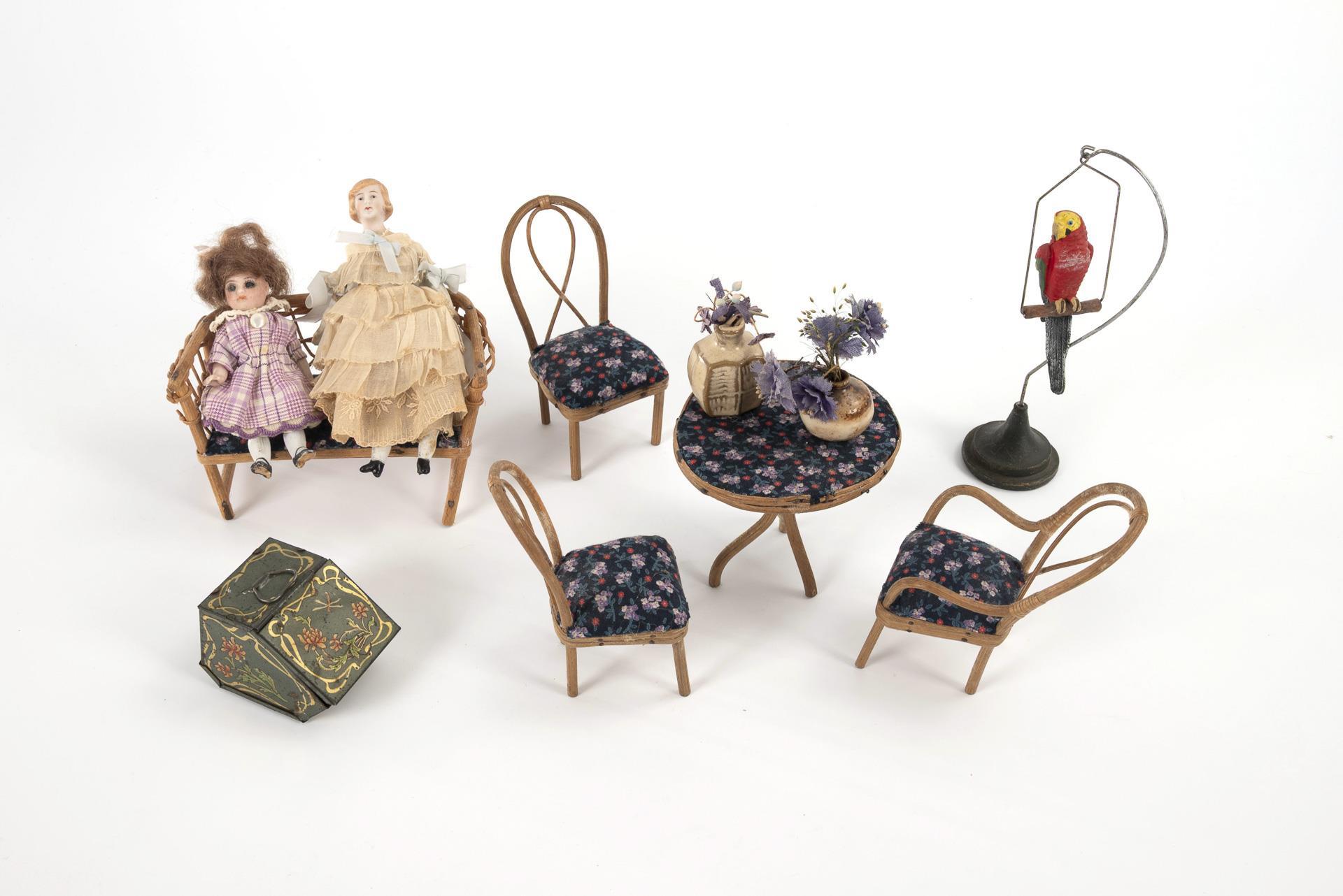 5 pieces of rattan furniture with flowered fabric covering: round table, bench and 3 chairs. Plus 2 little dolls, Elastolin parrot, coal box and 2 vases.