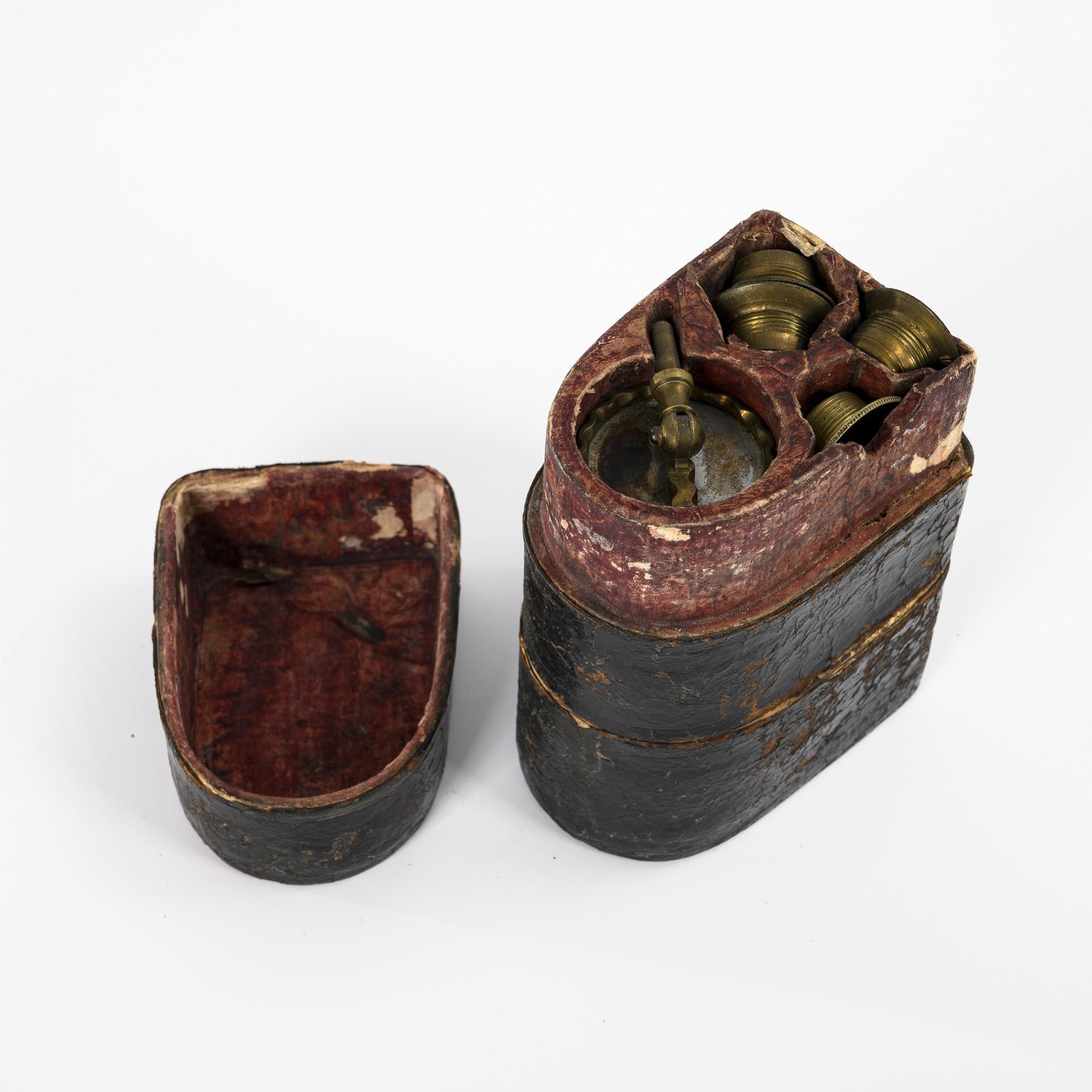 Brass, cardboard case with black leather cover, red marbled paper inside. Case 12 x 9 x 6.5 cm. 0.5 kg.
