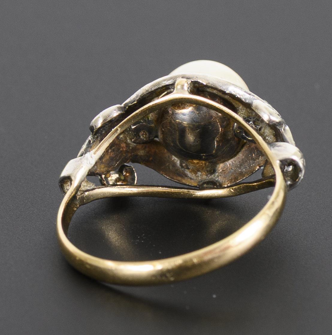The ring band is hallmarked yellow gold 14K (585), the ring head is tested silver. Ring size 57, the diameter of the pearl 8.68 mm. 4,1 g.