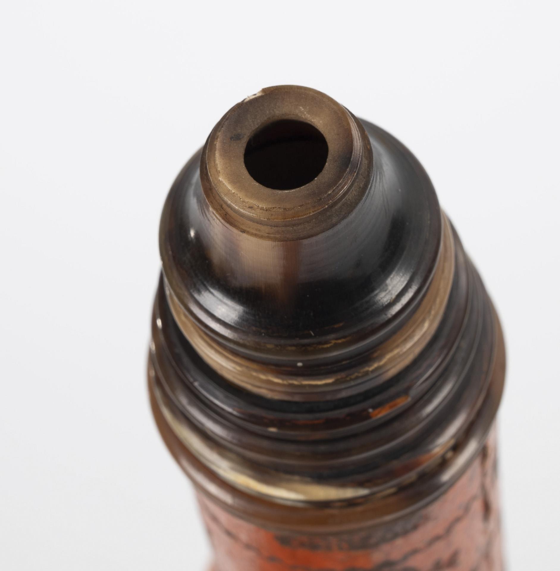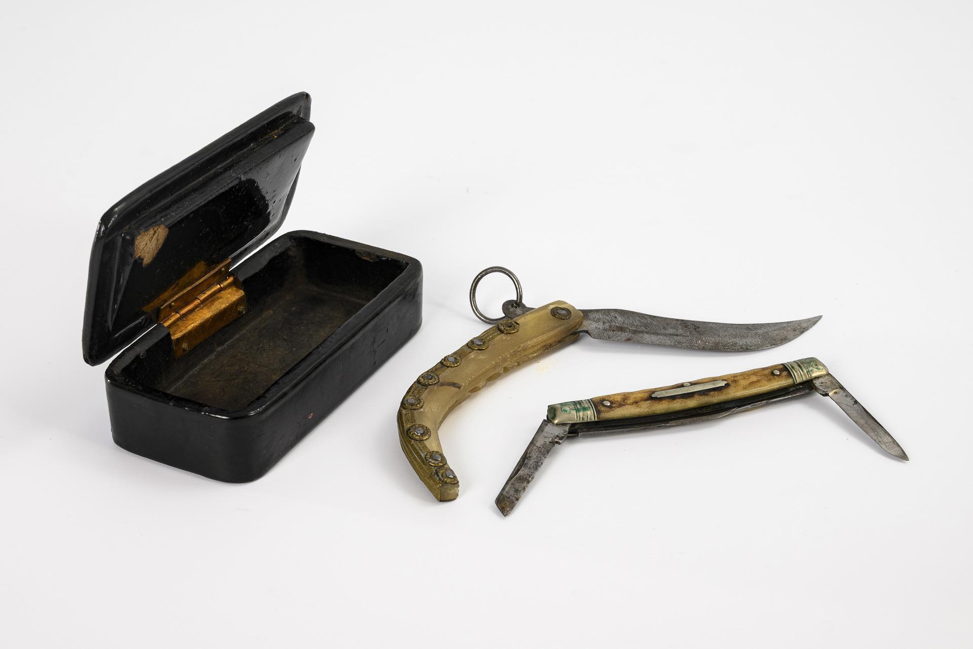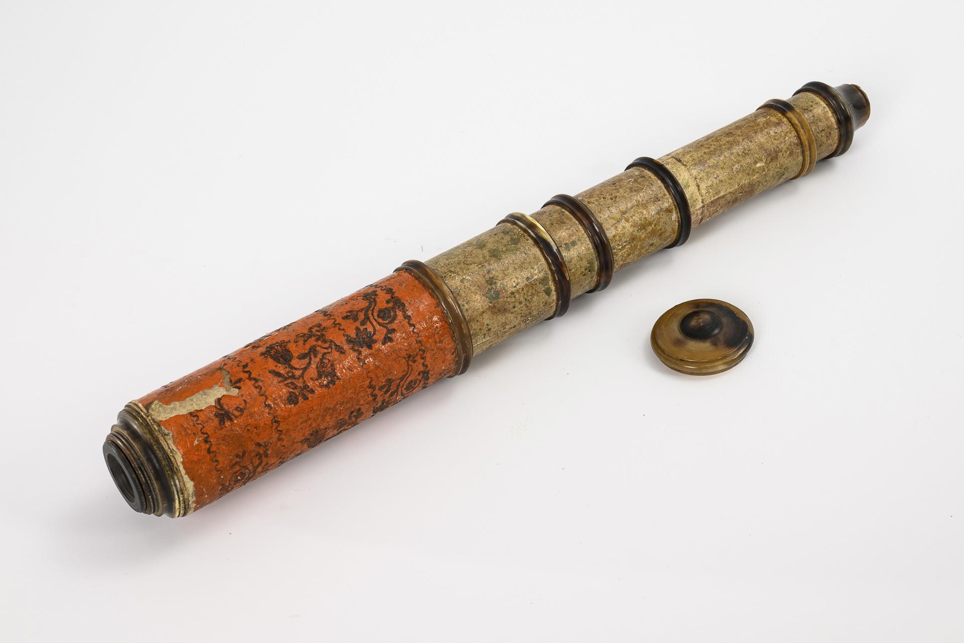 Baroque terrestrial, 5-bore telescope made of cardboard with turned horn guides and horn lens screw cap. Tube covered with ornamentally embossed, red-colored paper and indistinctly marked "Leonardo Semitecolo", extensions covered with lightly speckled paper. Inside 3 lenses in addition to the objective. Probably open eyepiece with missing screw cap. Some losses to the tube decoration / Baroque 18th century cutlery (knife and long meat fork), the handles decorated on both sides with iron carving and horn (figures on pedestal and dog with tendril); the blade with cross marks. Biedermeier tabatiere made of black lacquered papier-mâché with brass hinges; diamond pattern on the lid with imitation horn, imitation ivory and imitation malachite as well as pewter piqué. Some signs of age/use and chipping in the lid / 2 folding knives: Spanish Navaja with brass fittings on the light horn handle (small chipping) and small pocket knife with 4 blades on the antler handle.