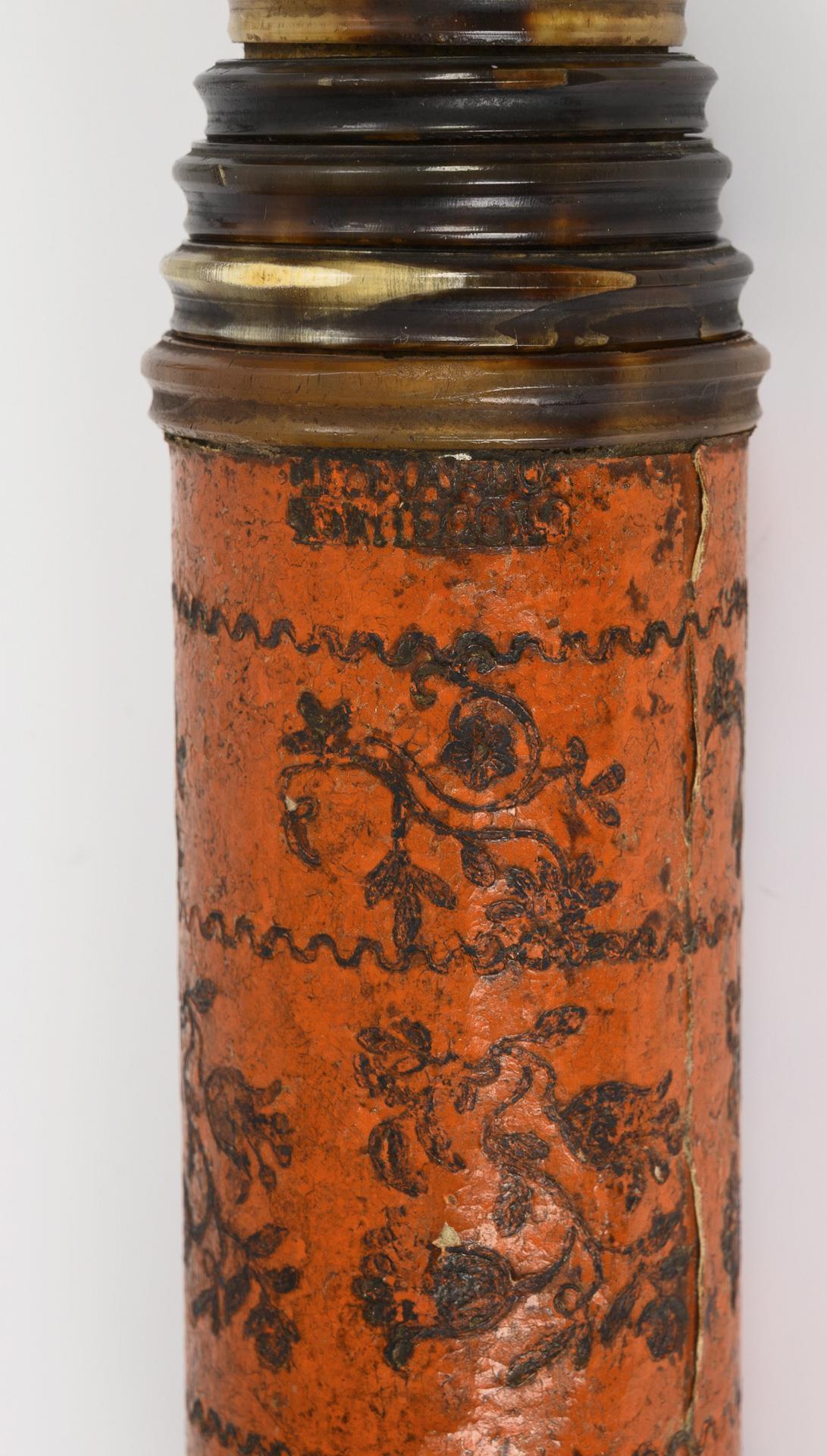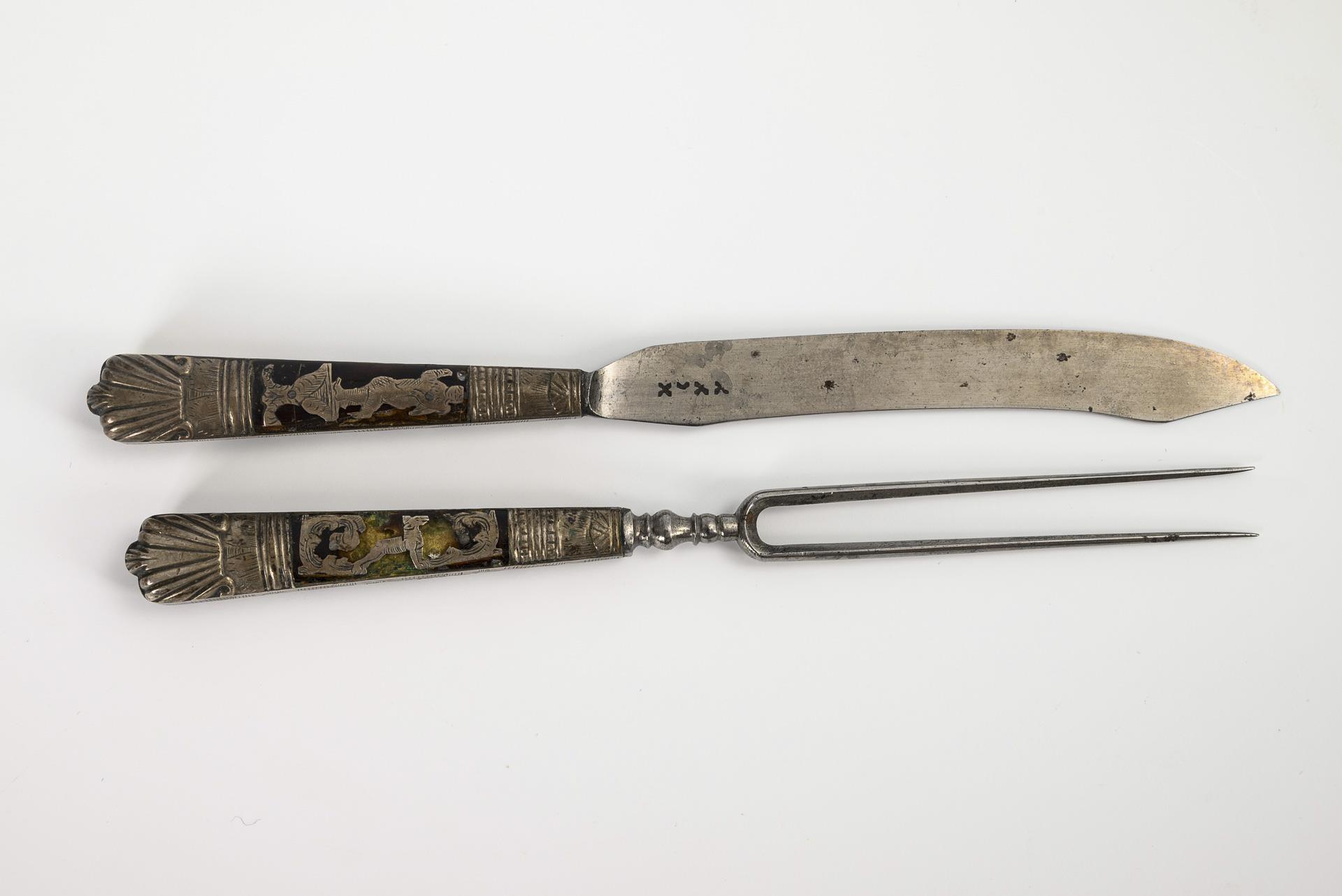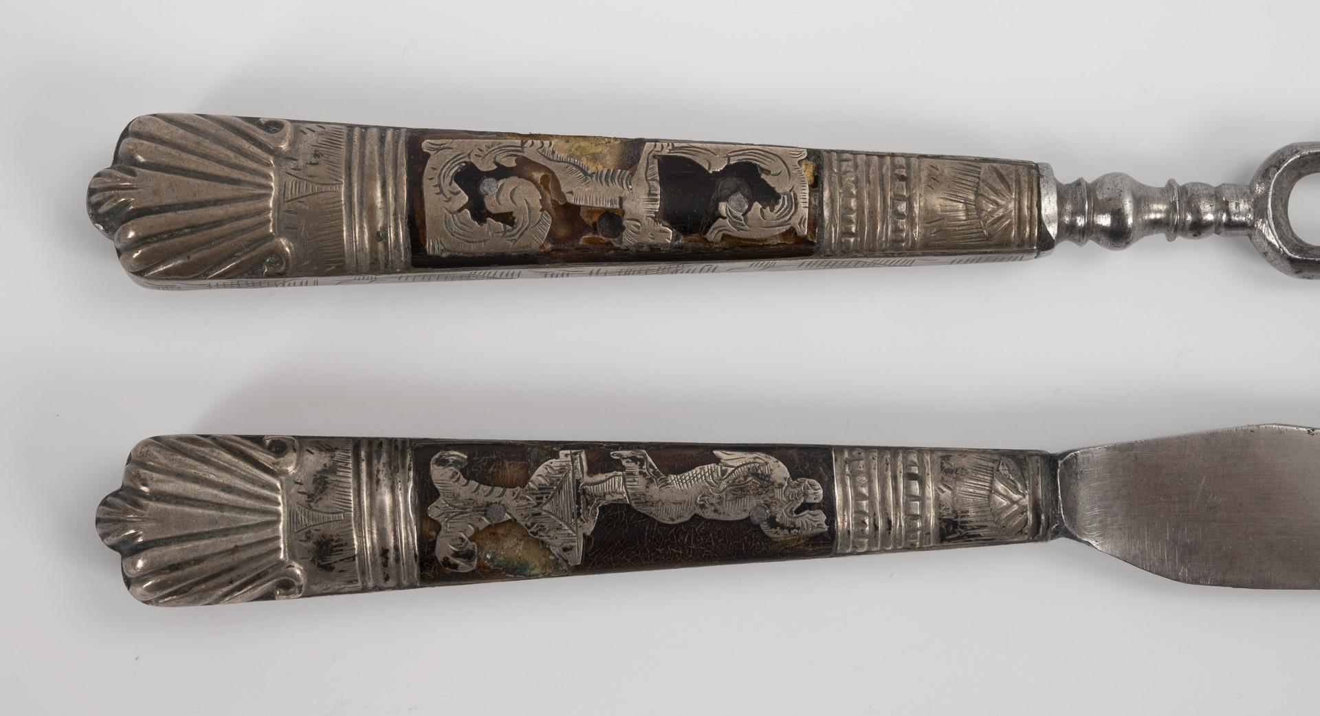 Baroque terrestrial, 5-bore telescope made of cardboard with turned horn guides and horn lens screw cap. Tube covered with ornamentally embossed, red-colored paper and indistinctly marked "Leonardo Semitecolo", extensions covered with lightly speckled paper. Inside 3 lenses in addition to the objective. Probably open eyepiece with missing screw cap. Some losses to the tube decoration / Baroque 18th century cutlery (knife and long meat fork), the handles decorated on both sides with iron carving and horn (figures on pedestal and dog with tendril); the blade with cross marks. Biedermeier tabatiere made of black lacquered papier-mâché with brass hinges; diamond pattern on the lid with imitation horn, imitation ivory and imitation malachite as well as pewter piqué. Some signs of age/use and chipping in the lid / 2 folding knives: Spanish Navaja with brass fittings on the light horn handle (small chipping) and small pocket knife with 4 blades on the antler handle.