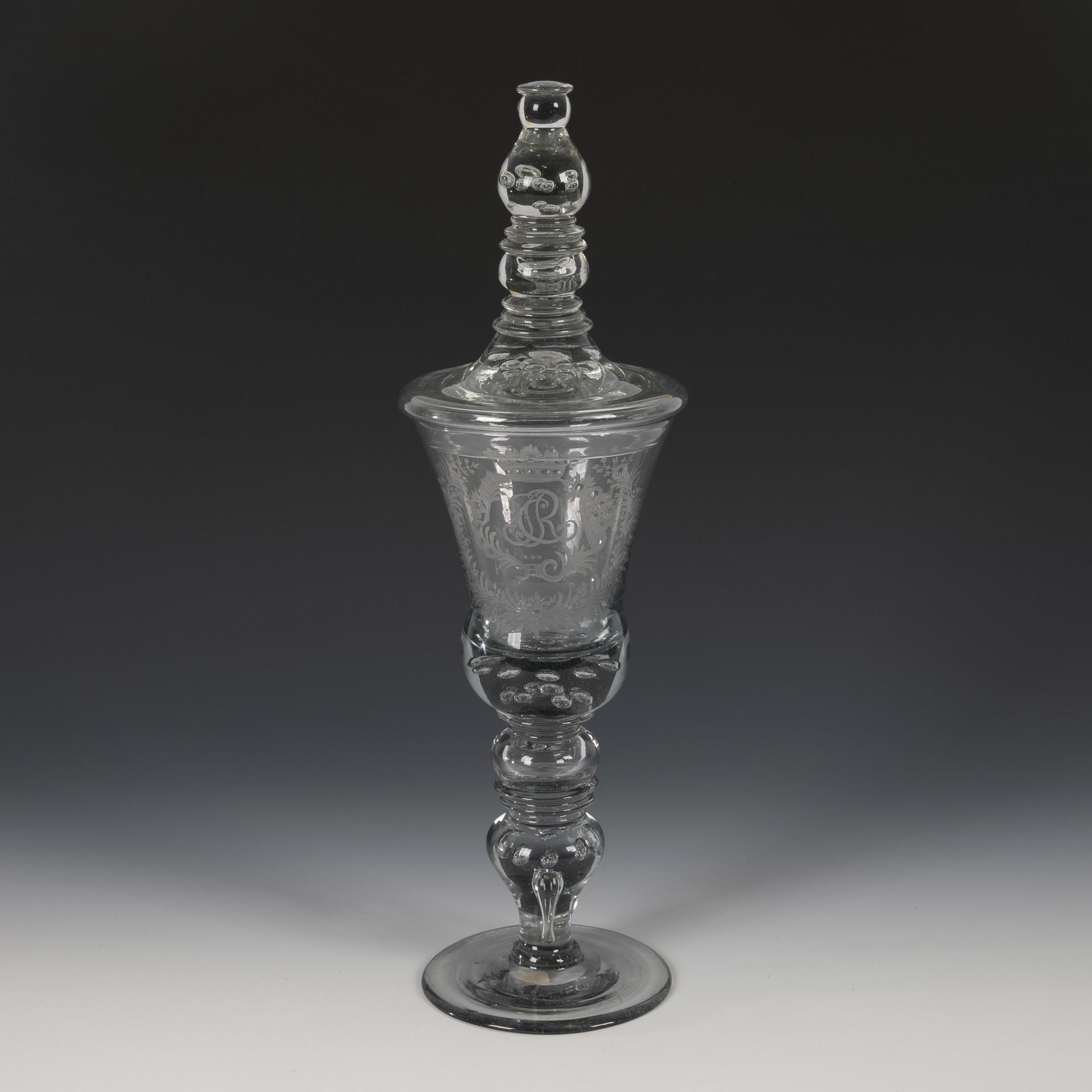 Baroque-style goblet with bell-shaped bowl, two superimposed, pierced bubble wreaths in the solid base, multi-jointed stem with hollow nodus, disc nodi and baluster with pierced bubble, pierced bubble wreath and small ring handle; disc base, lid with bubble wreaths and multi-jointed, high knob; dished rim. The monogram "JCR" framed and crowned by branches on the front. Chip on the pommel.