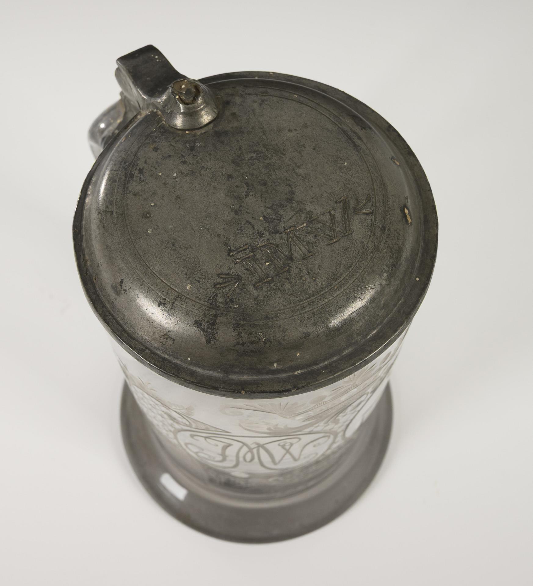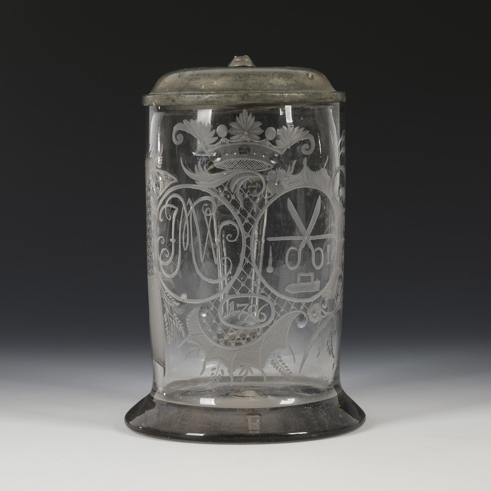 Cylindrical jug with flared stand, strap handle and pewter-mounted hinged lid; pontil mark. Rocaille engraving on the front with crown, cut lenses and two medallions, containing a ligatured monogram and the guild mark of the tailors' trade, dated "1792". Lid pusher missing.