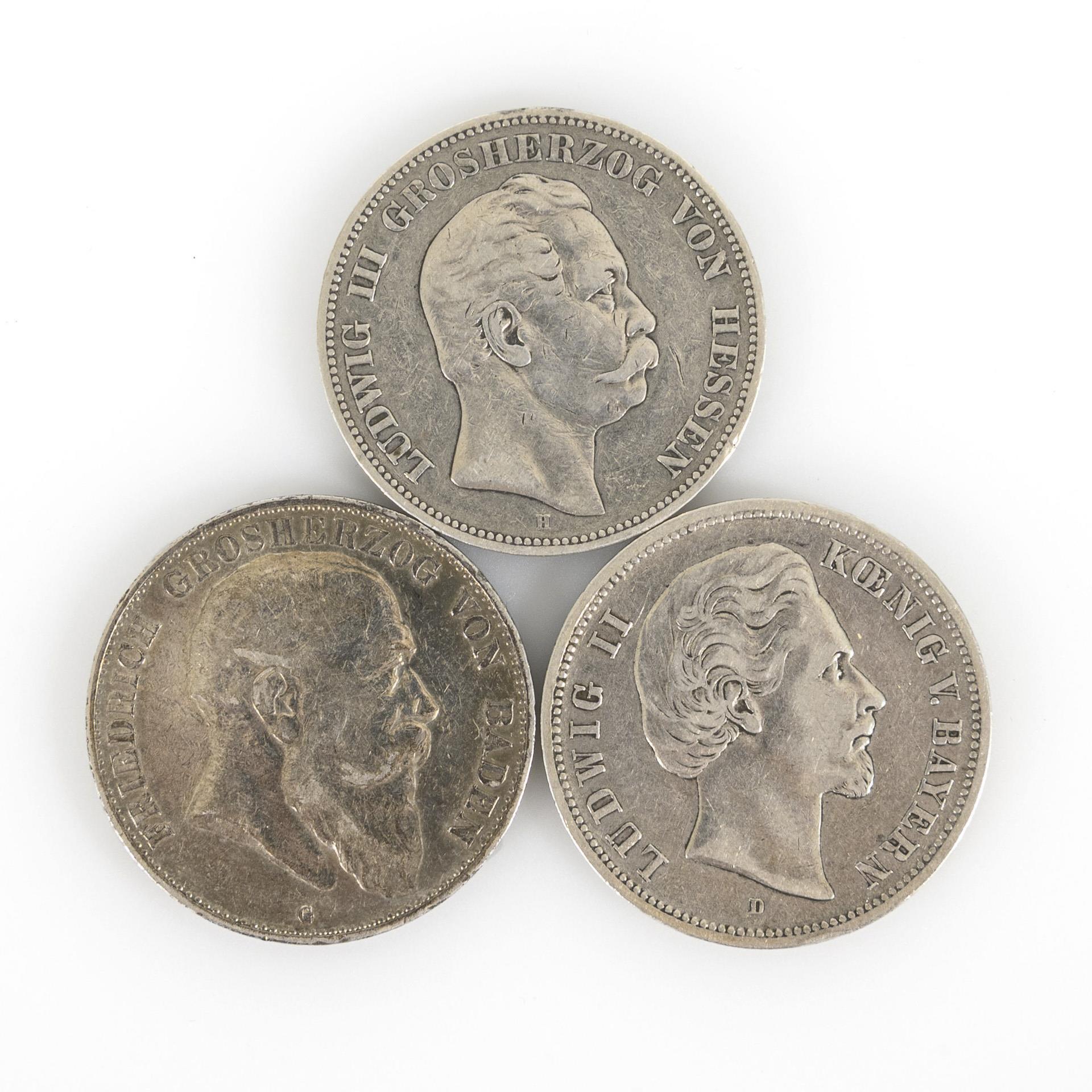 Bavaria 1875, "Ludwig II Koenig von Bayern", mintmark D. / Baden 1903, "Friedrich Grosherzog von Baden, mintmark G. / Hessen 1876, "Ludwig II Grosherzog von Hessen", mintmark H. All edge: "Gott mit uns". Condition: very fine.