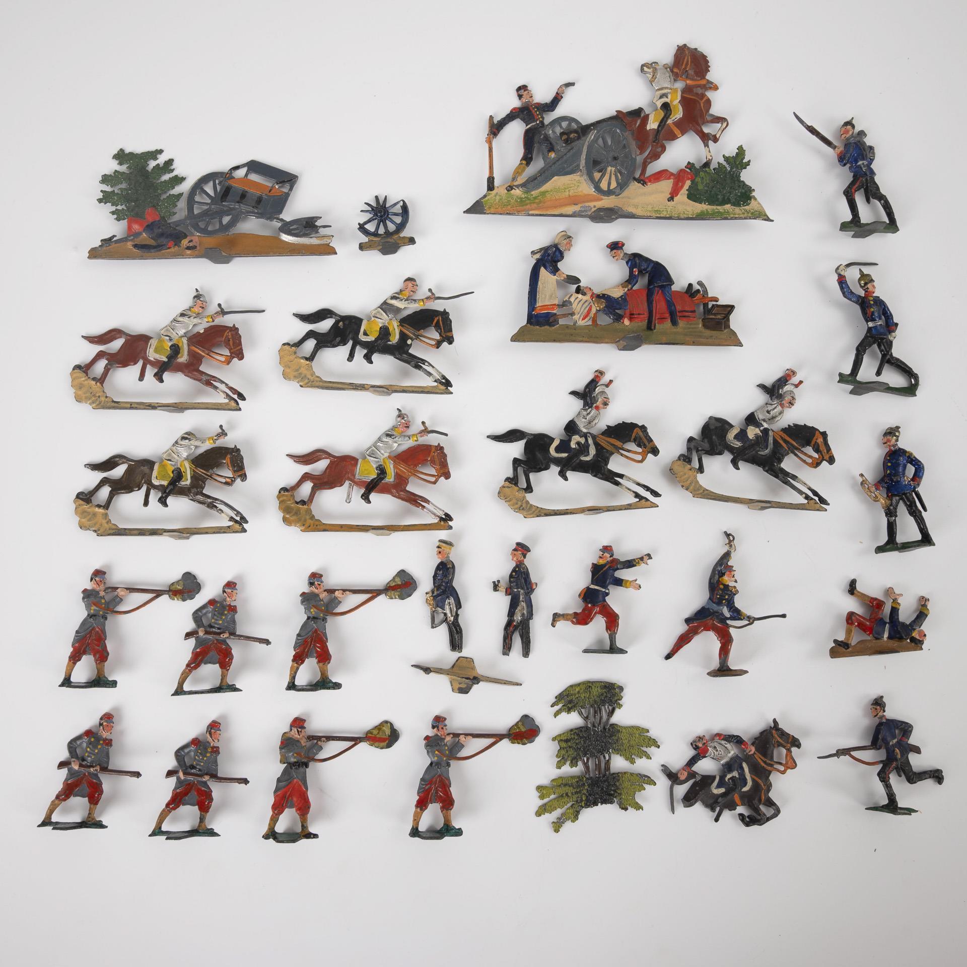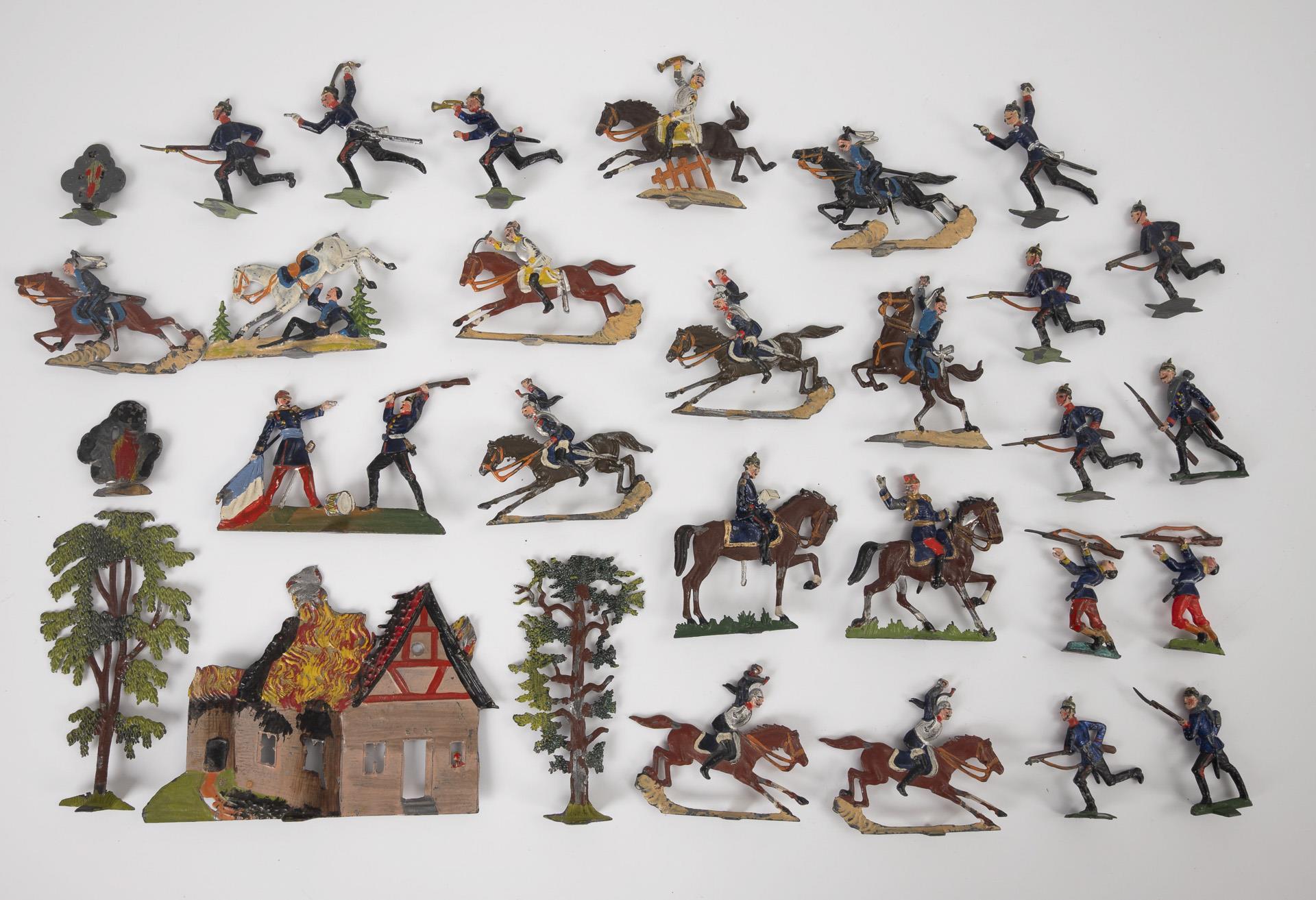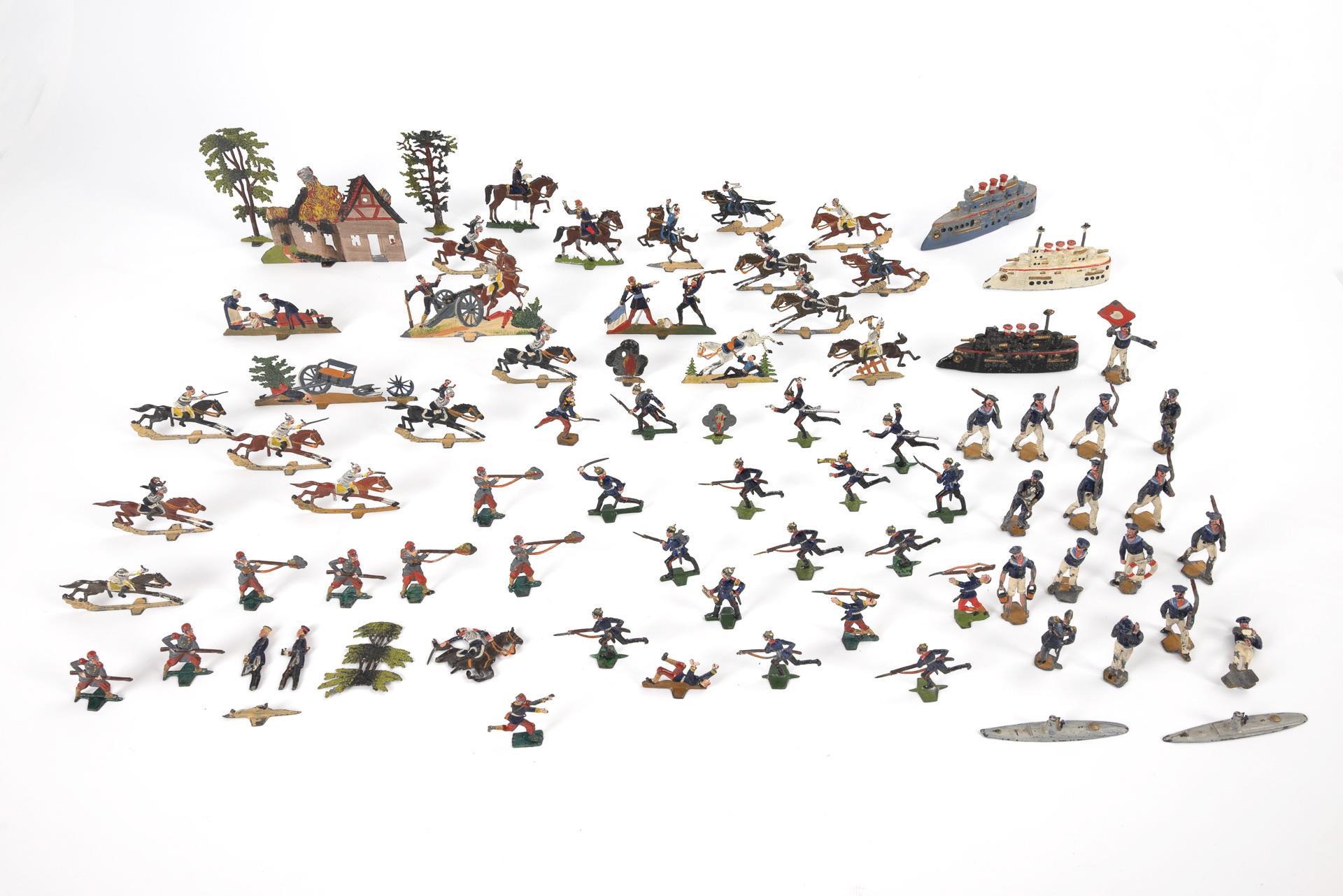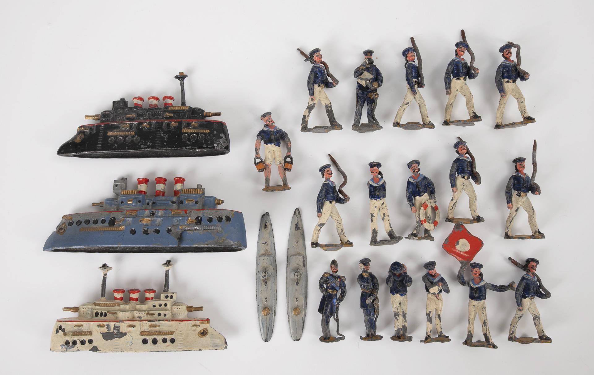 3 ships, 2 submarines, various sailors, numerous battle figures with horsemen, fighting foot soldiers, burning house etc. Paint defects, signs of age.