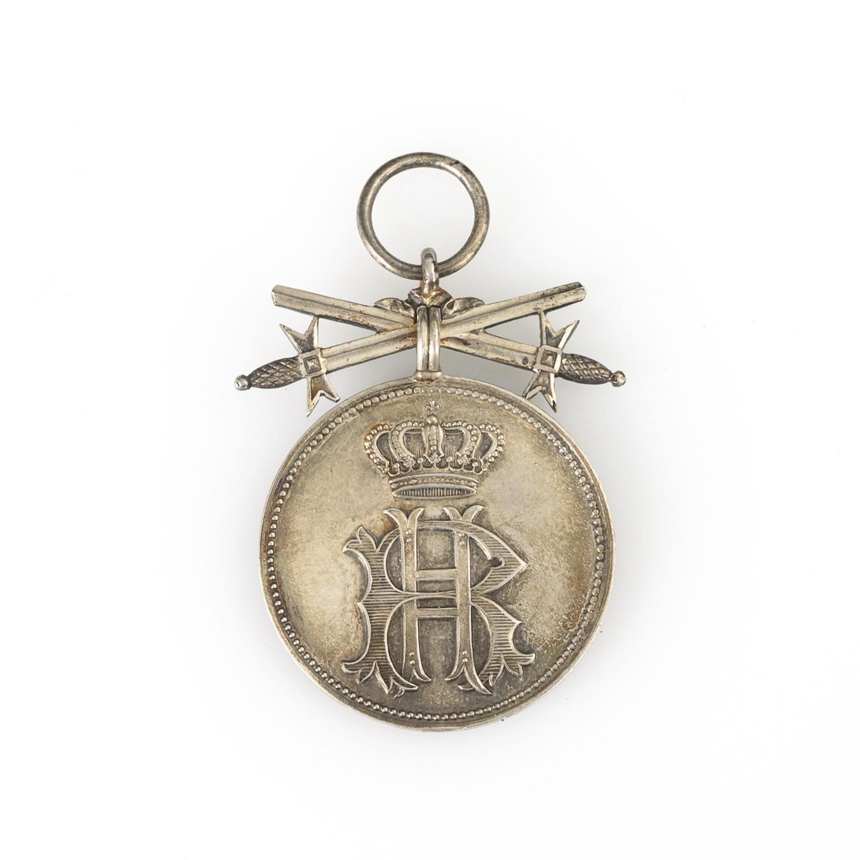 Medal of Merit 2nd model with swords for military merit. Obverse: Monogram HR with crown, reverse: "For merits". Some signs of wear, without ribbon, in defective original box.