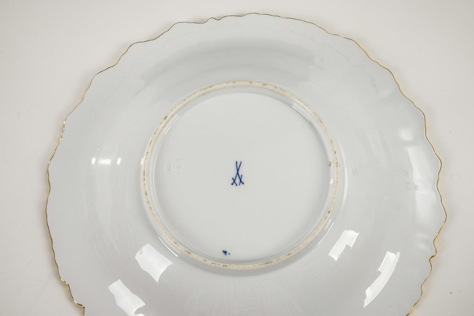 Plate with shell-relief flag and three rocaille shields, in the mirror a fruit bouquet with pear, plums and blueberries.