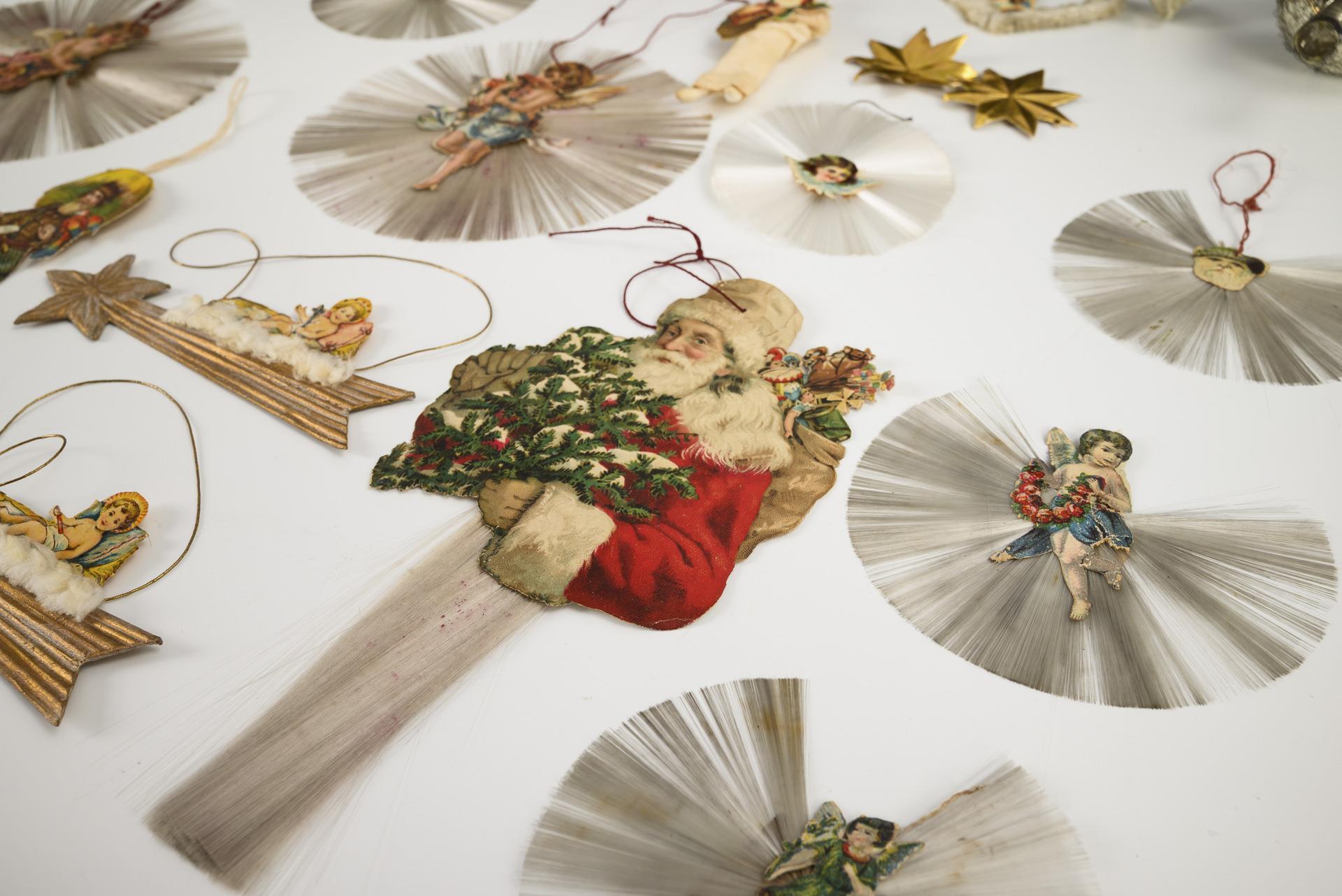 Extensive range for the Christmas tree: fiberglass decorations with paper cut-outs, Dresden cardboard and a glass tree topper. Comes with a mahogany-colored wooden box (5.5 x 22 x 17.5 cm). Some signs of age.