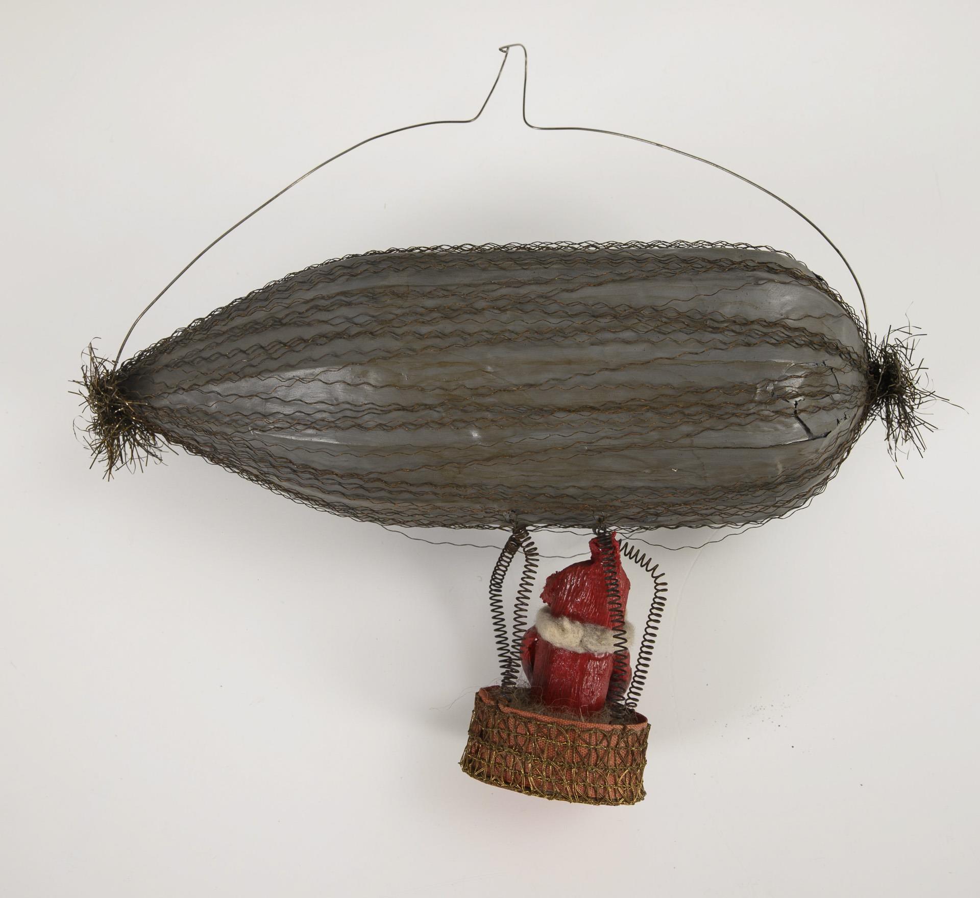 For Christmas decorations. Zeppelin with leonine wires and small gondola with Santa Claus. Body with small cracks. L 20 cm / Angel made from embossed cardboard. L 33 cm.