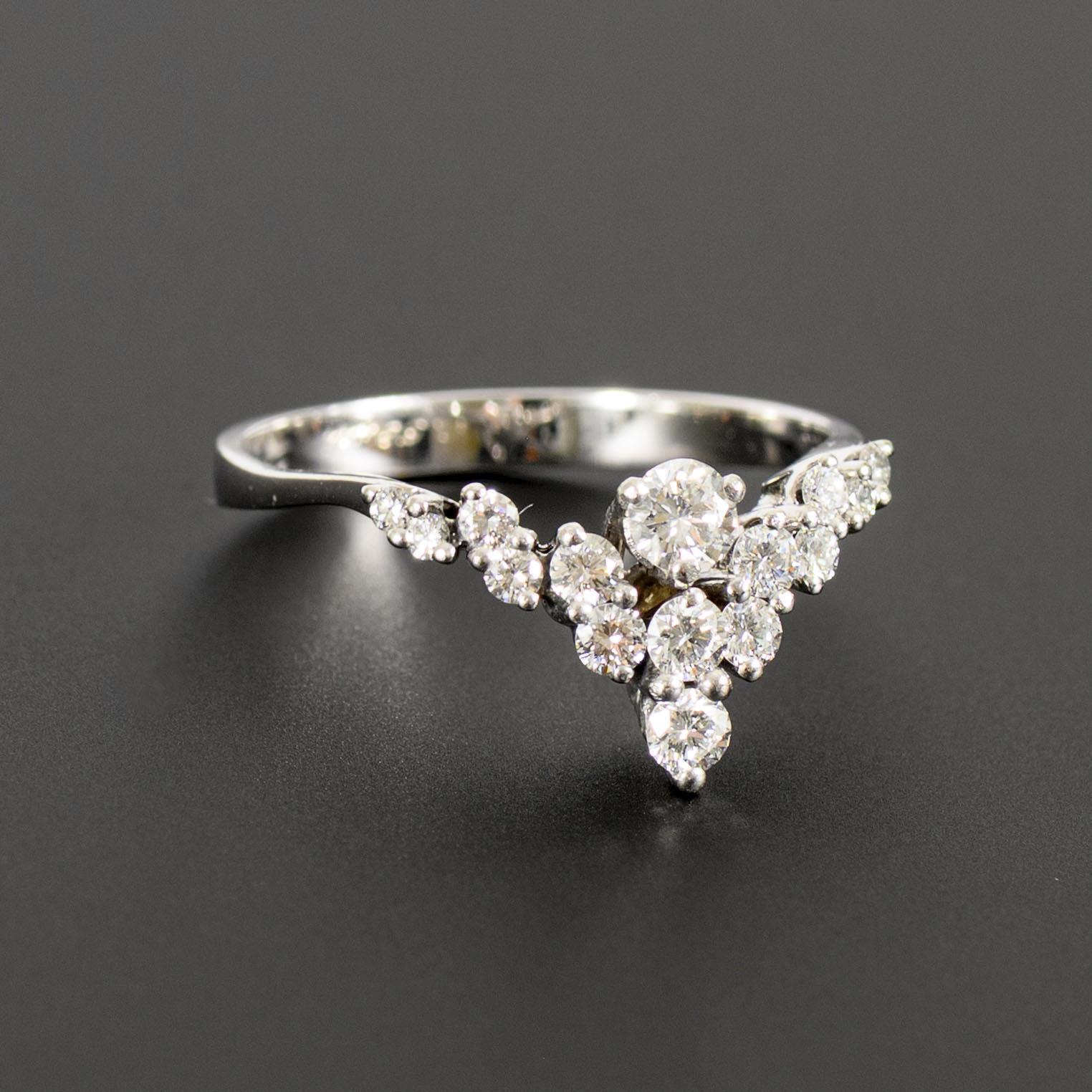 Modern ring with tiare-shaped setting of diamonds in various sizes.