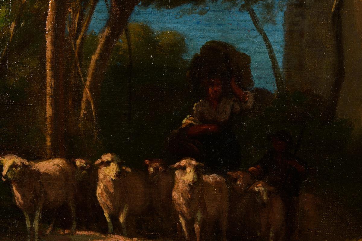 Hirtin mit Sohn und Schafherde auf dem Heimweg am Abend nahe einer Abtei.